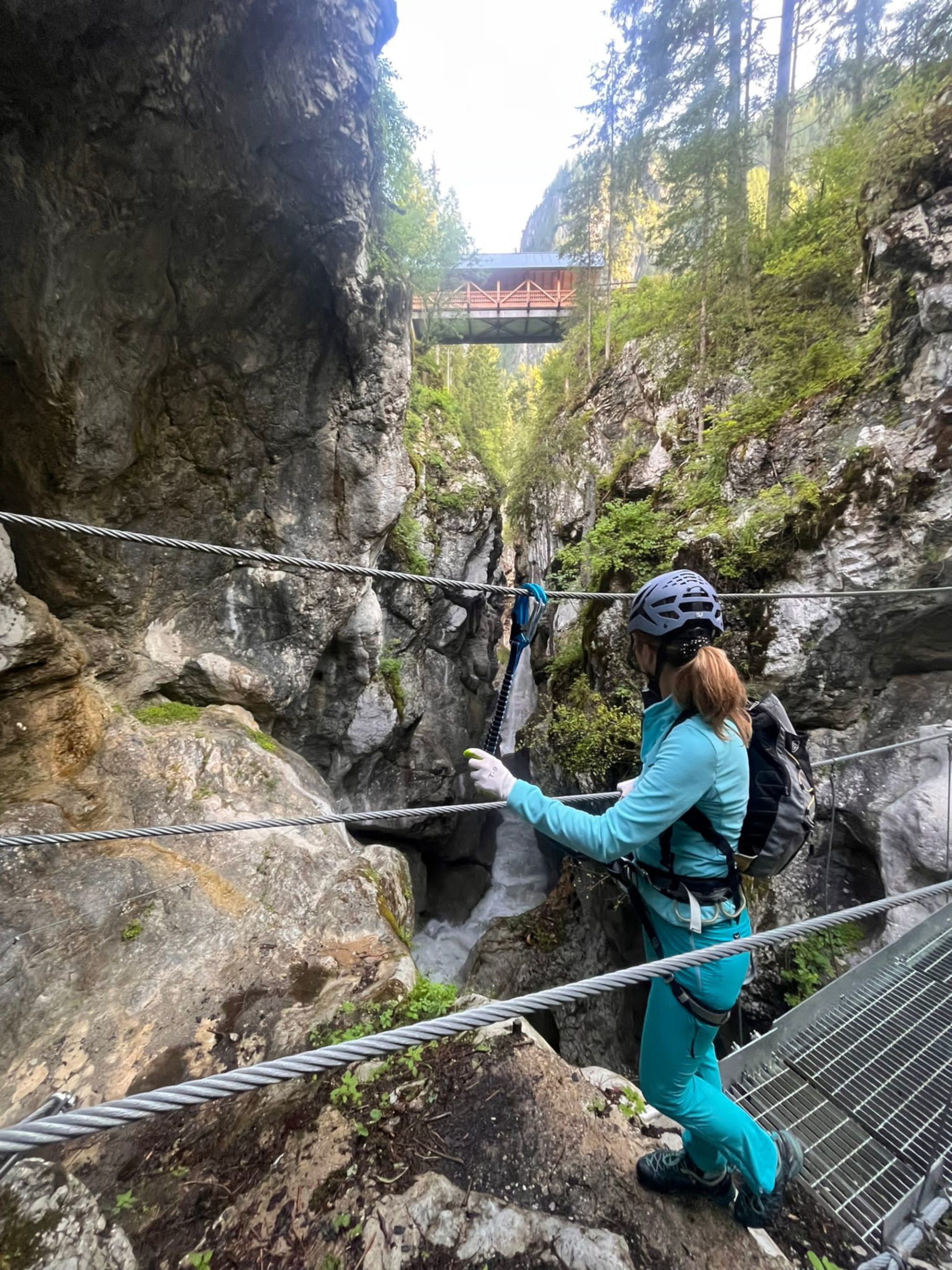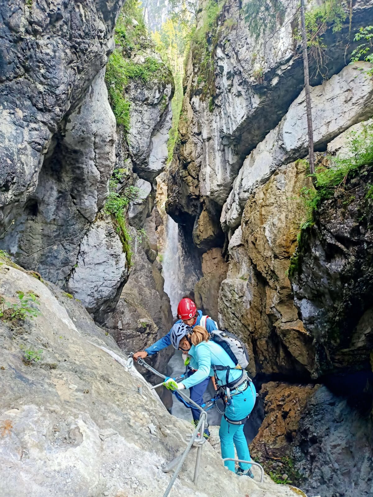 Le rocce sono lisce, c’è polvere di roccia che l’umidità rende scivolosa, ma sono più i passaggi su pioli in ferro che il contatto vero e proprio con la roccia, dove qua e là si posano i piedi. Occorre un minimo di allenamento di braccia perché ci si issa sempre sul cavo o sui pioli e i guanti sono utilissimi. In alcuni punti il senso di esposizione è davvero forte perché interamente a sbalzo sull’acqua vorticosa. Grandi anse, quasi delle caldere lisciate dall’acqua, accompagnano il percorso e in alcuni punti dalla strada e dal ponte soprastanti si è esposti alla vista degli spettatori che scattano foto.