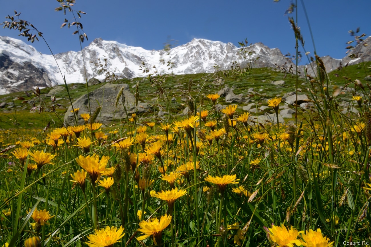 La Est del Rosa con un cespuglio di rododendri. Anche in questo caso il punto di vista è basso, con la fotocamera quasi al livello del suolo, per evidenziare il primo piano. Nikon D800; Nikkor 16-35 4 AFG; focale di 16 mm.