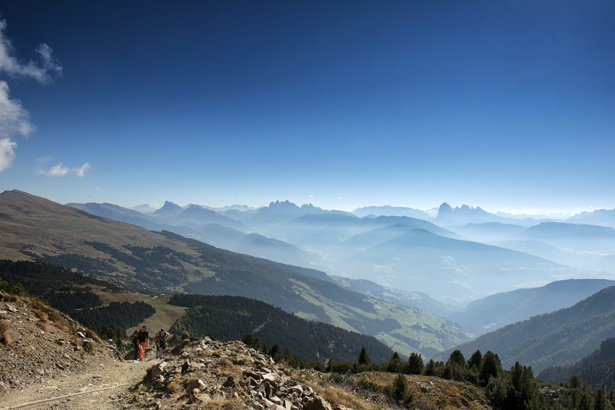 Dalla Croce di Lazfons lo sguardo spazia fino a Sassolungo, Punta Grohmann, Catinaccio d’Antermoia e Catinaccio: uno spettacolo da godere con calma, prima di tornare a valle.