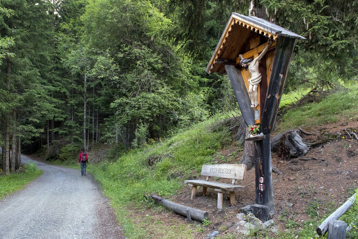 Si avanza fino a superare il torrente Plankenbach su terreno che diventa sempre più sassoso arrivando alla base del monte San Cassiano. Lo scenario cambia decisamente, alberi e boschi hanno lasciato il passo ad arbusti, muschi e fiori. La montagna è sempre più spoglia e le pendenze aumentano. Questo tratto oltre il torrente coincide con il percorso della Via Crucis. Il sentiero su fondo sassoso risale da qui con una serie di tornanti fino al Santuario della Santa Croce di Lazfons e all’omonimo rifugio posto proprio accanto a quota 2.311 m (tre ore dalla partenza).