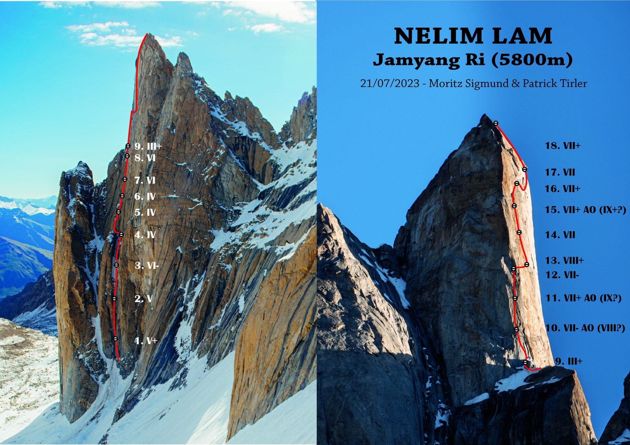 L’apertura della via, chiamata Nelim Lam (700 m, VIII+, A0), ha richiesto 18 ore tra salita e discesa. Non sono stati lasciati materiali in parete eccetto uno spit, che i due sono stati costretti a piantare in discesa, trovandosi persi nel mezzo della parete senza possibilità di usare ancoraggi naturali.