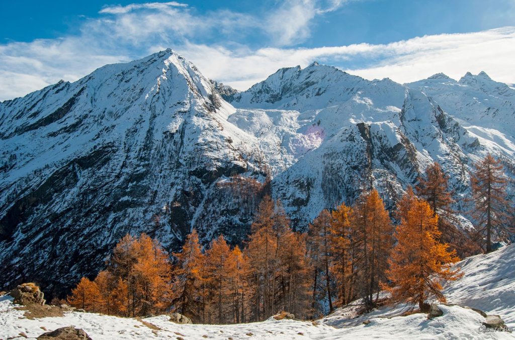 Il momento migliore per vedere da vicino camosci e stambecchi è l’autunno quando gli animali scendono alle quote più basse per cercare l’ultimo nutrimento prima dell’arrivo dell’inverno. La stagione fredda è un periodo complicato per questi ungulati che per nutrirsi saranno costretti alla ricerca di muschi e licheni e sporadici ciuffi di vegetazione, in punti esposti, dove la neve scivola prima. La Valnontey, laterale della Valle di Cogne, si trova nel Parco Nazionale Gran Paradiso, in una zona dal panorama grandioso con la testata della valle ricca di grandi montagne culminanti con i 4000 metri della cima del Gran Paradiso. Il panorama non è grandioso solo volgendo gli occhi verso l’alto, ma è particolarmente suggestivo anche lungo il sentiero che porta al rifugio Vittorio Sella, con sgargianti boschi di larice, tinti dalle tonalità dell’autunno.