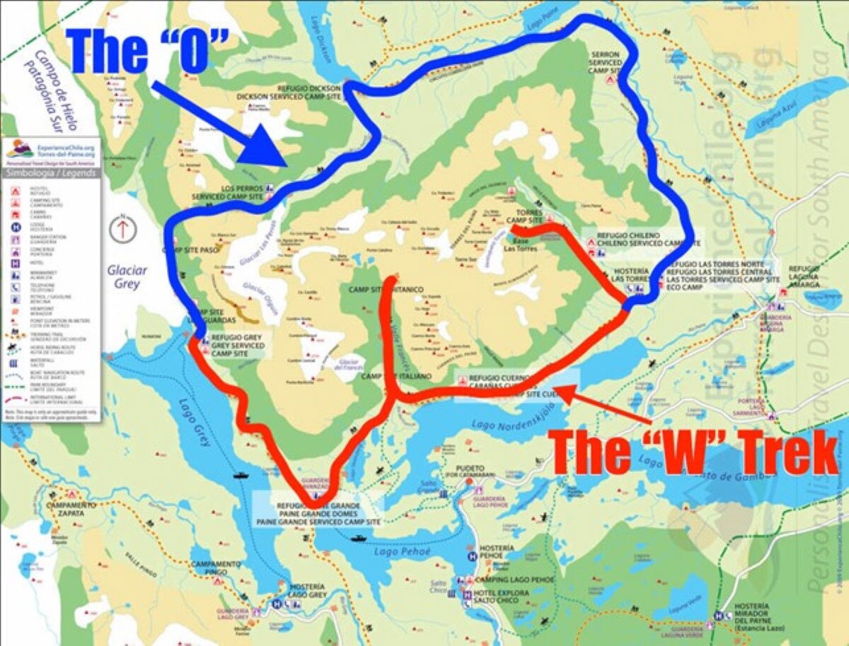 Il classico trekking che si svolge presso il parco è il cosiddetto “circuito W” (5-6 giorni), dovuto alla forma del suo itinerario. C’è anche un day hiking di 1-2 giorni che permette l’arrivo alla base delle magnifiche guglie di granito soggiornando al Campamento Torres per svegliarsi all’alba e raggiungere il mirador prima degli altri. E per chi ha più tempo ecco il circuito “O”, più lungo (130 km) e selvaggio che richiede una decina di giorni per completarlo.