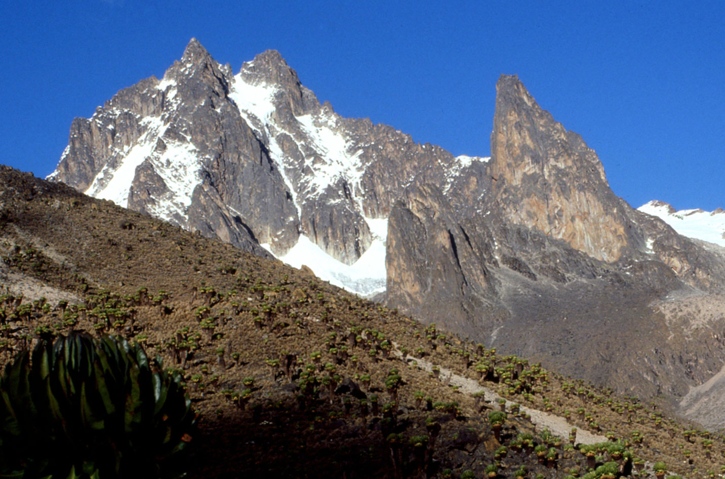 Molti alpinisti ammirano il Batian e il Nelion dalle ghiaie e dai seneci della Valle Teleki. Tra i due, visibilissimo in mezzo alla roccia lavica scura, scende il Diamond Couloir, la lingua di ghiaccio che prolunga verso il basso il Diamond Glacier.