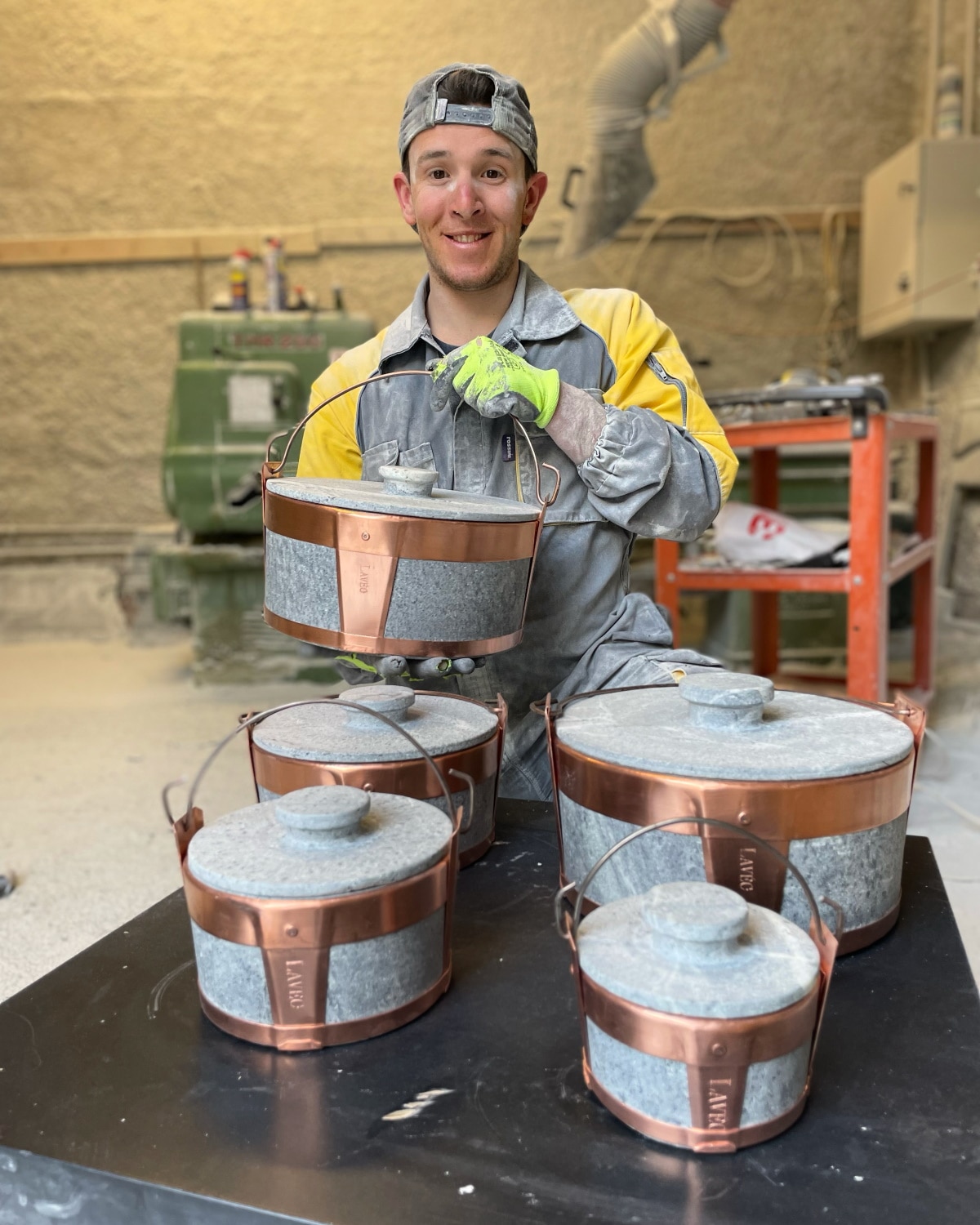 “Ogni lavéc è frutto della pazienza, della precisione e dell’amore per la pietra”, dice Nicola, che spiega: “Inizio mettendo il blocco di pietra sul tornio, per poi lavorarlo manualmente come si faceva una volta. In questo modo riesco a utilizzare al meglio la roccia e a ricavare più lavéc da un unico blocco arrivando fino a cinque. Lavoro prima l’esterno, poi l’interno e infine procedo con la lavorazione del fondo. Una volta terminato lo rilego”.