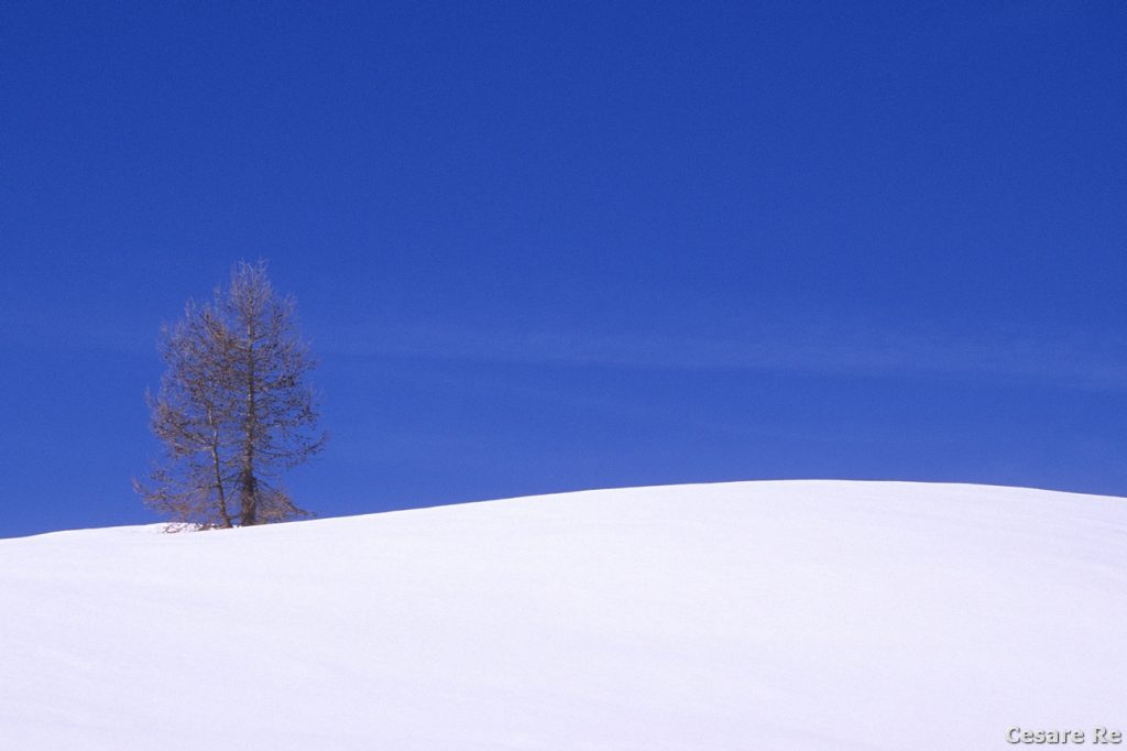 Come è possibile, quindi, rendere piacevole un larice sgombro dalla neve? Un metodo interessante è ragionare su linee e forme, cercando quasi di astrarre il soggetto, sfruttando le diagonali dei pendii innevati, oppure le ombre dell’albero stesso che, a volte disegnano geometrie molto nette. Il più classico esempio è l’ombra dell’albero sulla neve. A volte l’ombra stessa può fare da linea guida, convogliando l’occhio dell’osservatore verso le cime o altri soggetti specifici.