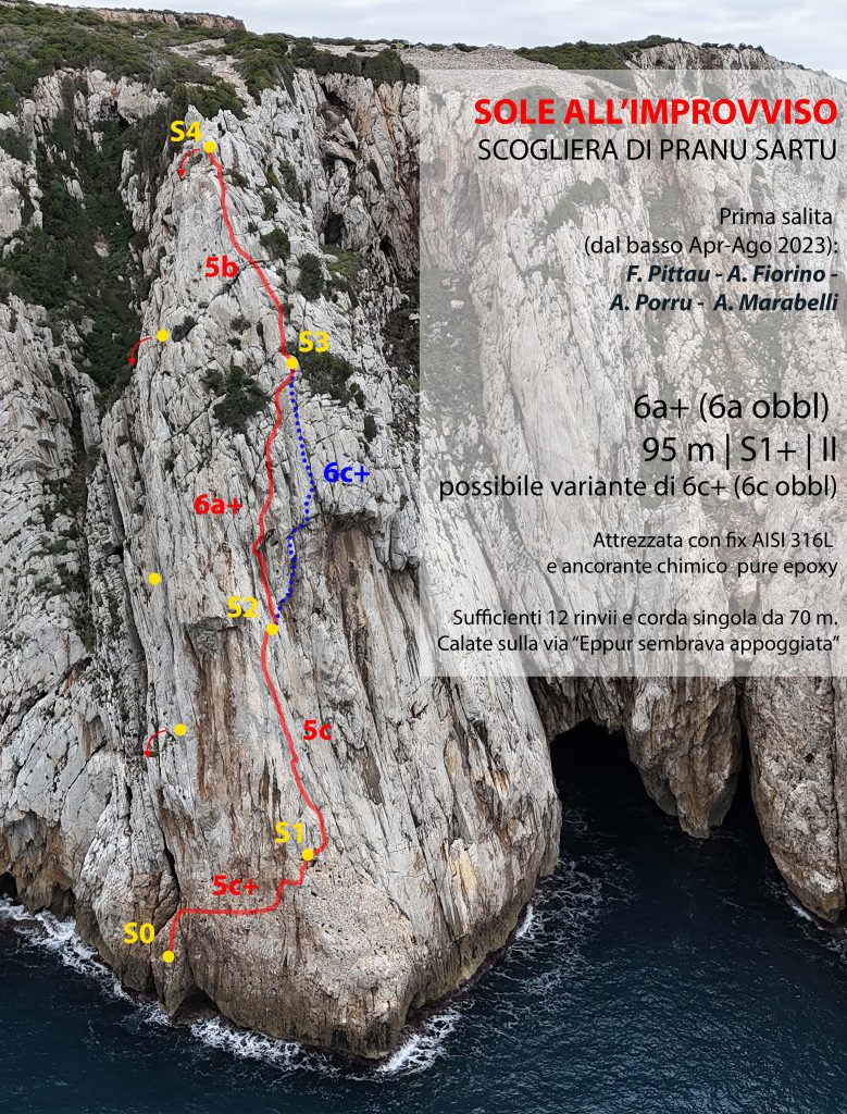 Qualche giorno fa, Maurizio Oviglia è andato a ripetere Sole all’improvviso, confermandone i gradi: “Grazie a Francesco Pittau, Andrea Porru, Arianna Fiorino e Anna Marabelli per questa nuova via su un pilastro in un angolo di scogliera che ancora non conoscevo. La roccia di Sole all’improvviso è semplicemente un’opera