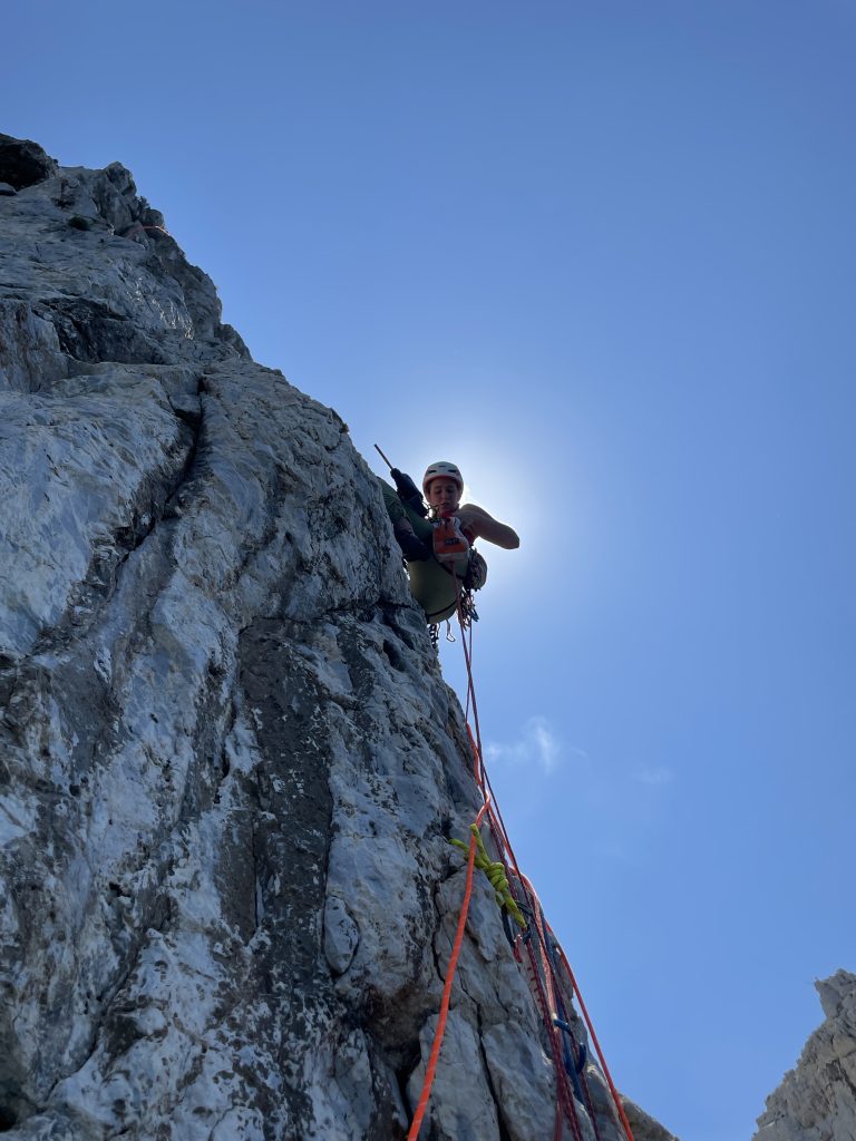 “Francesco aveva chiodato l’anno scorso una via a fianco, e andando a ripeterla abbiamo visto la linea di Sole all’improvviso, che passa sullo spigolo e sembrava più facile. Eravamo incerti per via del terzo tiro strapiombante, non era il massimo chiodare una via di V con un tiro di 6c a metà; invece alla fine è venuta fuori una via di 6a+ divertente” prosegue Arianna. È presente inoltre una variante in fessura di 6c+, per chi volesse cimentarsi in gradi più duri.