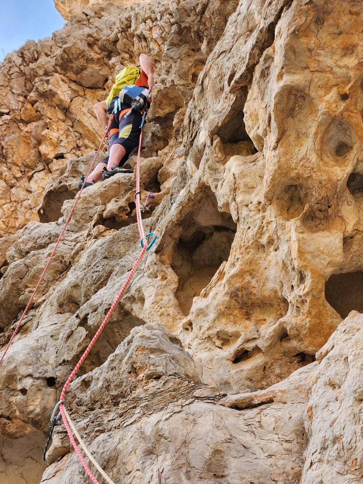 Giunti alla base della parete si iniziava subito ad attaccare la via ipotizzata nei giorni precedenti procedendo tiro dopo tiro, nonostante il caldo, su una roccia caratterizzata da formazioni e buchi (tafoni) scavati da acqua e vento.