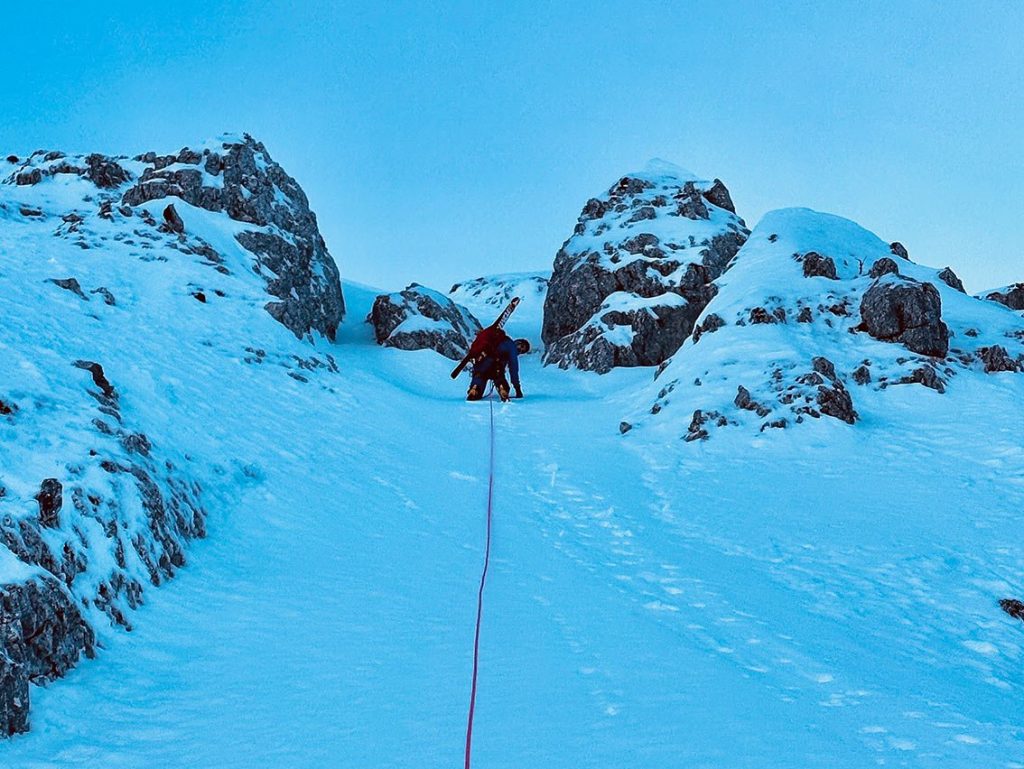 Se il primo terzo della via si è svolto con un’arrampicata su misto difficile e poco proteggibile, la parte più alta è stata un susseguirsi di canaloni e creste con le condizioni di neve più variabili. “Al centro della parete ci siamo presi una pausa per ricaricare le energie: fai bollire dell’acqua, mangia barrette e cambia i guanti”.