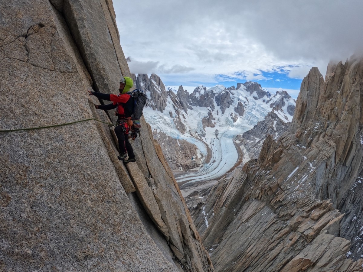 Il trio arriva a El Chalten poco prima di Natale e subito si lancia in una salita di ambientamento sull’Aguja Guillaumet. Ci siamo. “A fine anno arriva una finestra di bel tempo di tre giorni. Bel tempo ma vento abbastanza forte, che in Patagonia non è mai da sottovalutare. Tuttavia, abbiamo deciso di azzardare e partire”, racconta l’alpinista.