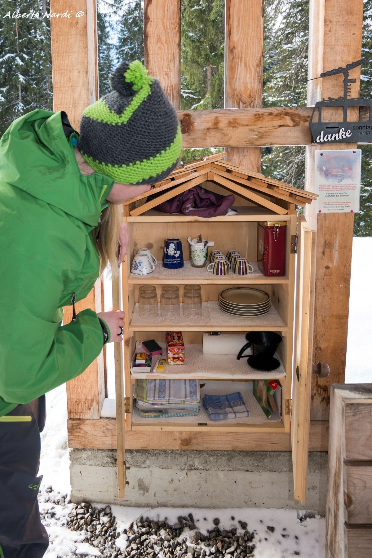 Continuando a scendere (circa 400 m di dislivello) verso la stazione della funivia, si incontra una rustica struttura in legno attrezzata con tanto di barbecue. Il luogo giusto per una sosta grazie agli abitanti del villaggio che provvedono a rifornire il materiale necessario, tazzine comprese, e a tenere pulito il posto, da lasciare comunque come lo si è trovato.