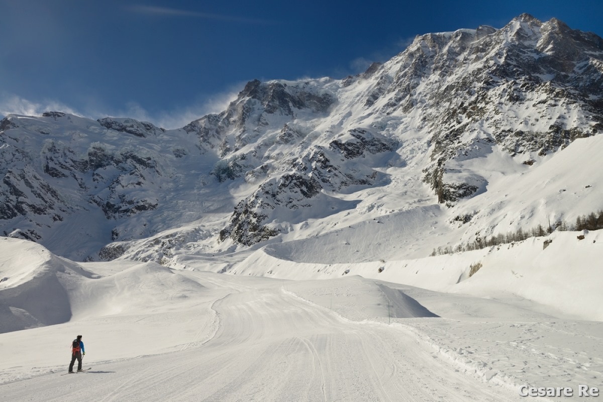 Più avanti nella stagione quando la neve inizierà a scarseggiare e muoversi sulla morena potrebbe essere problematico, si potrà raggiungere la conca dell’Alpe Pedriola dove sorge il rifugio Zamboni seguendo il sentiero estivo. Un’alternativa che può essere sfruttata anche per effettuare il ritorno seguendo un itinerario differente, seppur meno panoramico e più distante dalla Est.
