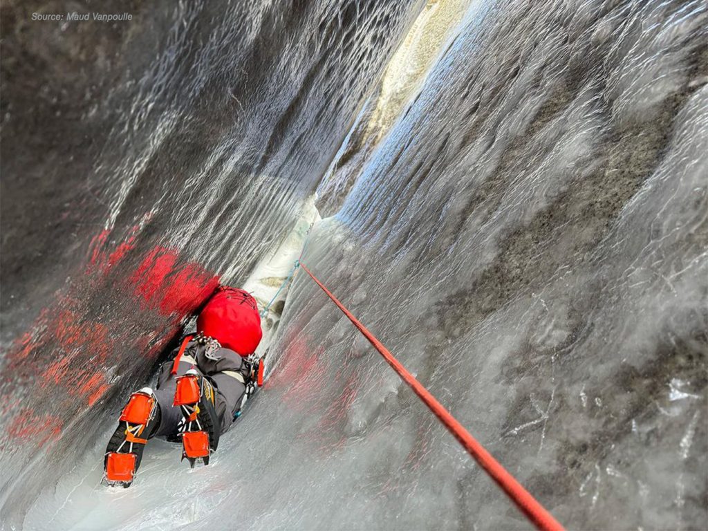 “Il giorno dopo ci addentriamo nel mondo del Cerro Torre. Un po’ di brina, poi il tiro di ghiaccio della vita, 60 metri in un camino che si apre verso la cima. E poi un tiro di V su roccia marcia che permette di acclimatarti al 6c che lo segue: 60 metri di roccia discutibile in una cascata d’acqua. E poi i due 7a…va molto al di là di quello che avevamo immaginato nei nostri film. Piangiamo tutte e tre”, racconta Fanny Schmutz.