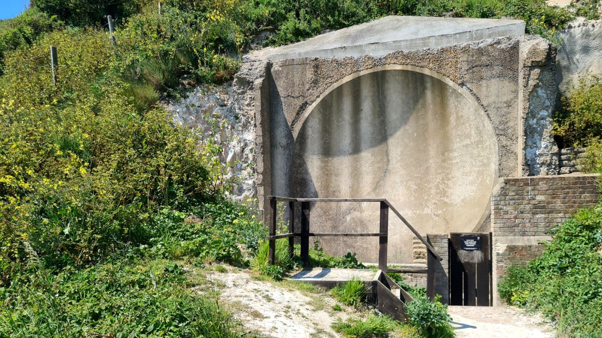 Dall’ultimo crinale si può scendere a sinistra per un evidente sentiero che scende in una conca erbosa, e risale con un tratto ripido, toccando l’ingresso del Fan Bay Deep Shelter, un tunnel in cemento utilizzato come ricovero nella Seconda Guerra Mondiale dai militari addetti alle postazioni di artiglieria e ad altri impianti. I tunnel del Fan Bay Deep Shelter, utilizzati durante la Seconda Guerra Mondiale dai militari addetti ai fari, ai radar e alle postazioni antiaeree della zona, possono essere esplorati solo con le visite guidate che partono dal Centro Visitatori. Anche qui le diramazioni che si avvicinano all’orlo della scogliera richiedono la massima cautela. Si cammina per 0.45 ore fino al Centro Visitatori, e altrettanto da questo alla stazione ferroviaria. Se si è a piedi e si vuole visitare il Castello di Dover occorre seguire la strada, che scende e poi risale ripidamente fino all’ingresso. Occorrono 0.30 ore in più (esclusa la visita), non ci sono alternative all’asfalto.