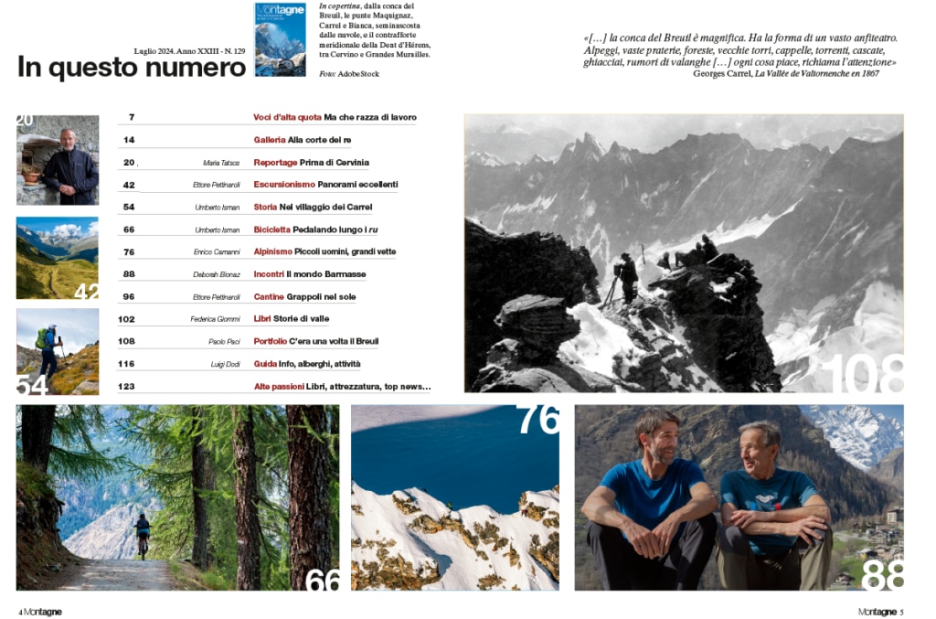 Il numero 129 della rivista accompagna i lettori alla scoperta della vallata ai piedi del Cervino. La Gran Becca questa volta rimane sullo sfondo e sembra illuminare territori e paesi defilati. Ma ricchissimi di soprese: sportive, culturali, golose