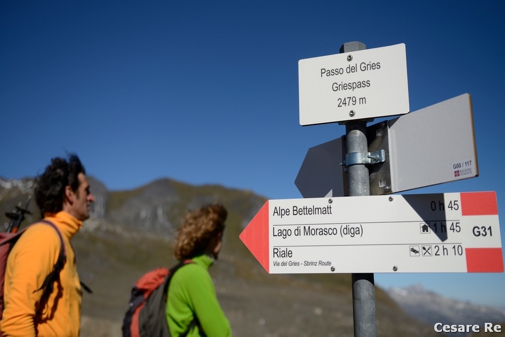 Ancora una ripida salita e si arriva al pianoro e alla palina che segnala il Passo Gries (2462 m; 2,30 ore; + 734 m), al confine elvetico, circondato da un paesaggio quasi circolare, con roccia e morene, la piramide della Punta dei Camosci (3044 m), la vetta del Blinnenhorn (3374 m), con il discendente Ghiacciaio di Gries che, in tempi più freddi, declinava verso le acque del lago, dove oggi è ben visibile la roccia liscia e levigata. Si fiancheggiano dal sentiero sovrastante, le rive del lago, proseguendo verso l’intaglio del Passo del Corno (2485 m) che discende poi nella valle omonima. Si prosegue in falsopiano, costeggiando due laghetti di fusione, per scendere sino alla Capanna Corno Gries (2338 m; 1,30 ore dal Passo Gries), con ampio panorama soprattutto sulle ravvicinate forme della Scaglia del Corno (2640 m). Si scende, ignorando la deviazione che scende in Val Bedretto, per costeggiare le cime del gruppo della Punta di Elgio. Alcuni tratti moderatamente esposti, consentono di proseguire sino a deviare sulla destra (cartelli) e raggiungere il Passo San Giacomo (2313 m; 1,45 ore dalla Capanna Corno Gries) che immette in territorio italiano. Si scende ora verso il Bacino del Toggia (G 20), sovrastato dal Basodino (3272 m) e su ampia mulattiera sterrata, si arriva al Rifugio Maria Luisa (2160 m; 1 ora dal Passo San Giacomo). Da qui si scende lungo la carrozzabile sterrata (G 20), con bella vista sul Corno di Ban e sul Lago di Morasco, per tornare sino a Riale ed al parcheggio (1 ora dal Maria Luisa).