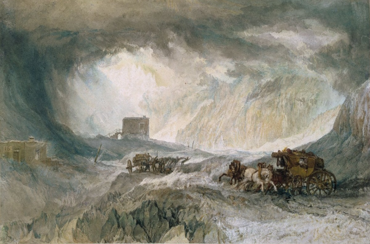 Nel 1819 William si reca in Italia a caccia di spirazione per le illustrazioni del libro The Picturesque Tour of Italy. È datato 1820 – e quindi probabilmente correlato a questa trasferta – il quadro Tempesta di neve sul Moncenisio, conservato al Birmingham Museum. Turner è stato un pittore estremamente prolifico, quindi non è facile orientarsi nella sua produzione. Ma quest’opera – un acquerello – è di grande suggestione: nubi nere incombono basse, creando una sorta di tunnel da cui fa capolino la luce, che illumina il paesaggio roccioso. Lungo il sentiero, i cavalli scivolano sulla neve e i carri appaiono impossibilitati a procedere. Gli uomini lottano contro una natura matrigna che sembra non dare scampo. Turner genera orrore e stupore negli occhi di chi guarda, e la consapevolezza di quanto sia insignificante l’energia dell’uomo di fronte alla potenza della natura. Se Turner si limita a osservare dal fondovalle, l’alpinismo che è in ascesa nel corso dell’Ottocento si ribella a questo cliché di finitezza umana. L’età della conquista delle vette è ormai aperta.