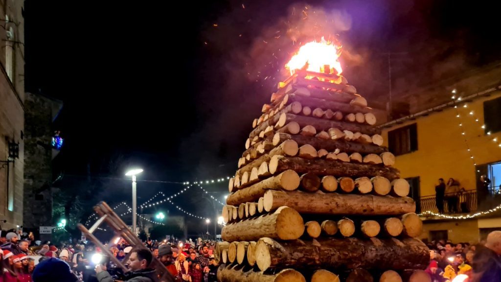 Per tutto l’autunno, i “fiaccolai” perlustrano i boschi di faggi, querce e abeti della montagna per cercare la materia prima con cui fabbricare le grandi cataste di legna (le più alte raggiungono i sei o i sette metri) destinate a essere accese il 24 dicembre.