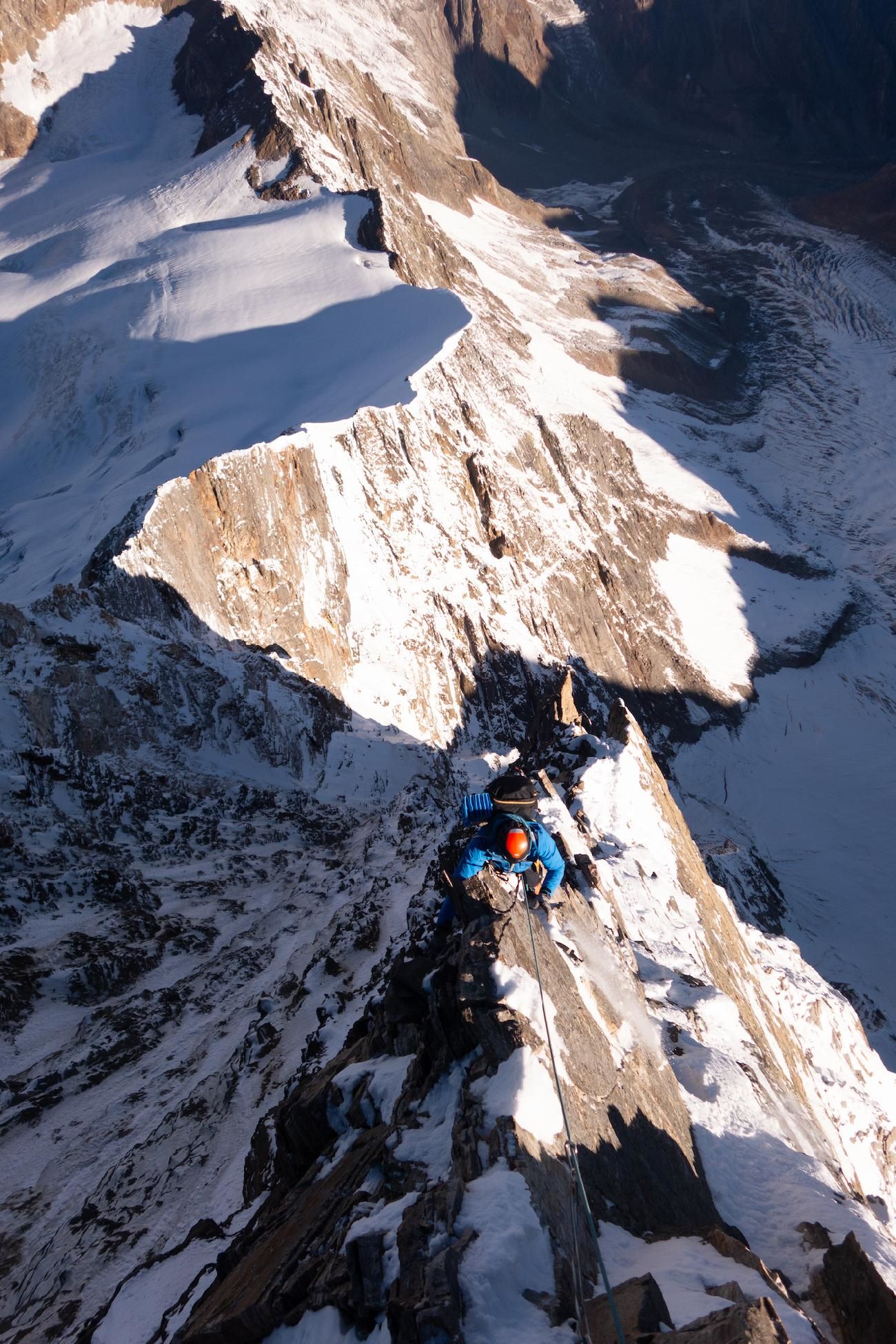«La traversata in salita, che abbiamo affrontato il secondo giorno, – continua Nathan – si è rivelata il tratto più difficile. Al di sopra, un’arrampicata particolarmente tecnica e spudoratamente lunghissima sulla cresta ci ha condotti alla vetta alle 19 del 6 ottobre, ma la nostra avventura non era ancora finita».