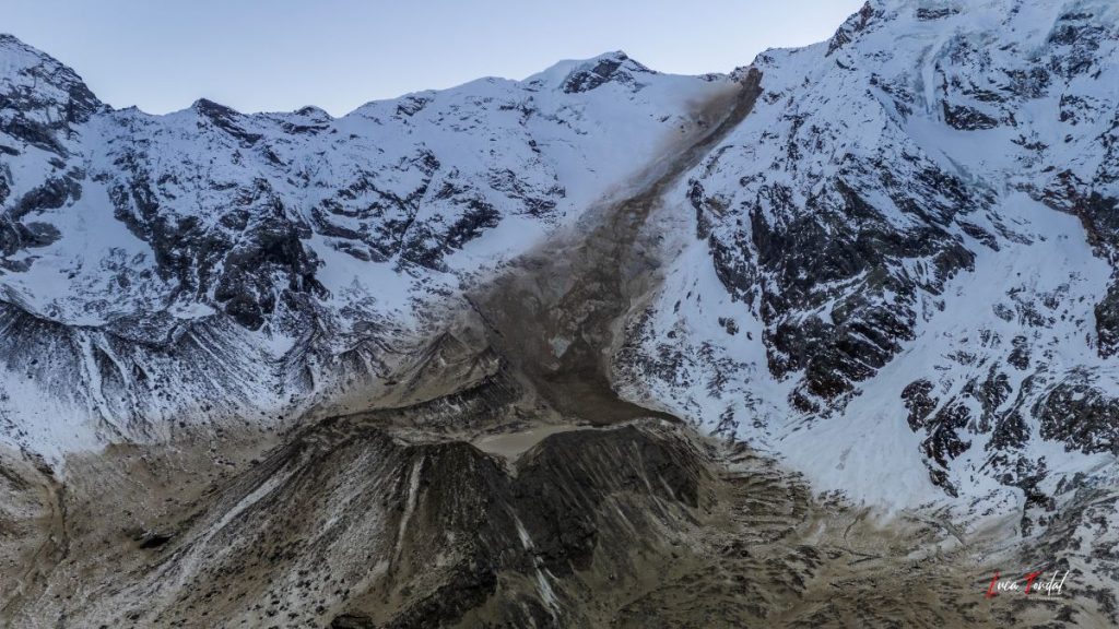 Le immagini all’elicottero che ci ha inviato Luca Tondat mostrano la vi a seguita dal materiale che,staccatosi da una quota di circa 3.400 metri, si è in massima parte riversato nella morena del ghiacciaio del Belvedere, ai piedi della Punta Gnifetti. Tutto intorno, e per un’estensione di oltre un chilometro, la neve è coperta da terra e polvere, offrendo un desolante colpo d’occhio.