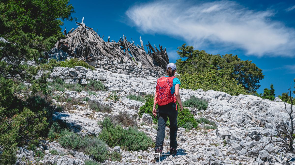 Continuiamo a camminare su una buona ed evidente traccia che dopo un breve tratto inizia a scendere verso il mare e davanti a noi si ergono Punta Giràdili e Monte Ginnìrico che dovremo risalire lungo una cengia molto nota per poi proseguire fino al primo punto di bivacco. La salita di cengia Giradili inizia dopo un ovile ed è abbastanza impegnativa ma la fatica è ripagata dal panorama sul mare e su Bacu Orrolossi. La salita termina in prossimità del Cuile Us Piggius. Pochi minuti ancora e si raggiunge l’area prevista per la notte. Il silenzio e il buio qui sono quasi assoluti, a rompere la quiete solo qualche maialino selvatico e le capre presenti ovunque lungo tutti i 55 km di Su Accàrgiu.