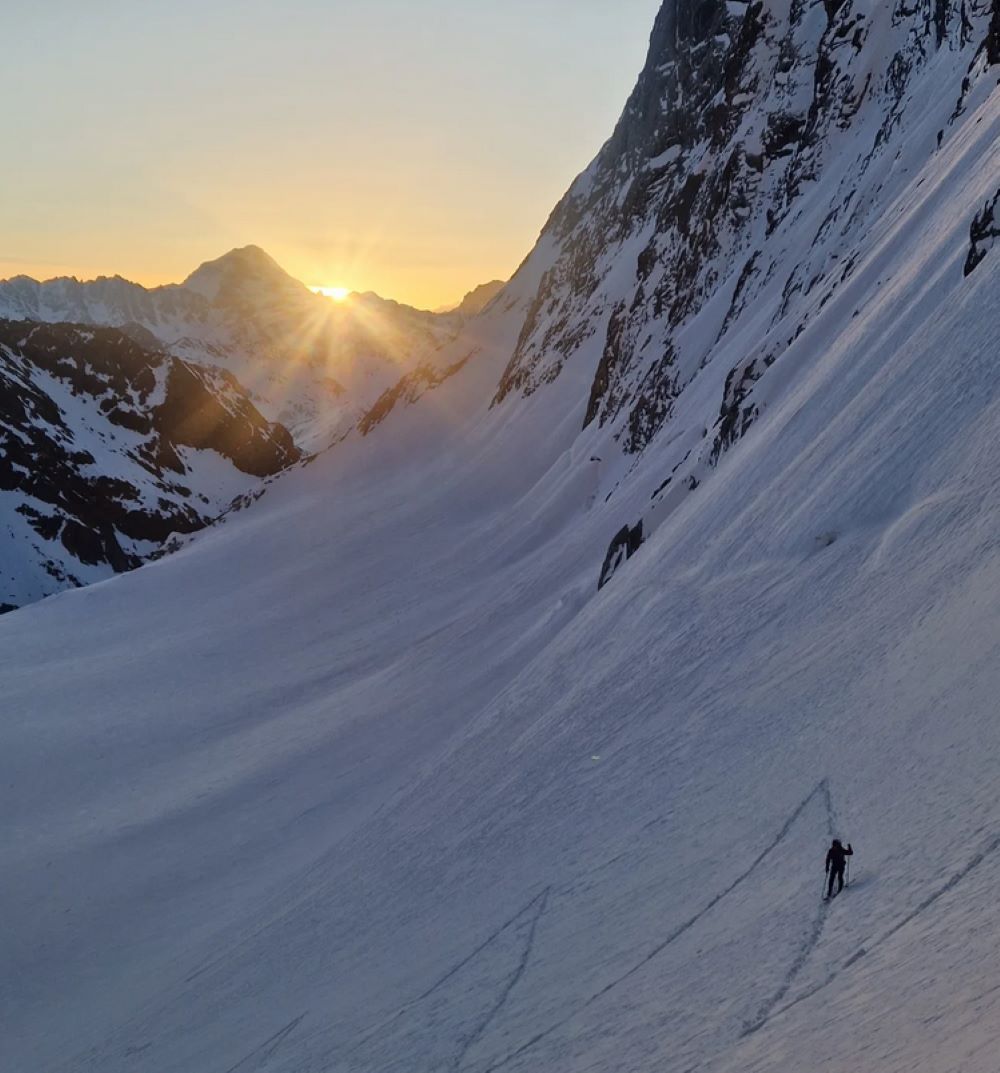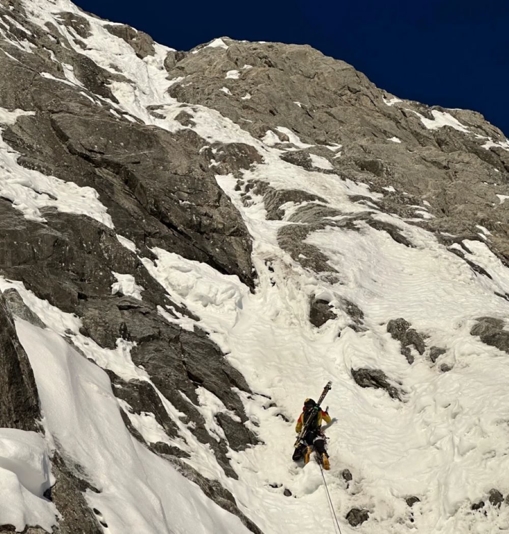 L’idea era quella di scalare leggeri e dinamici portandoci dietro gli sci per scendere agevolmente sul versante opposto. Ne è nata un’avventura stupenda dove abbiamo combinato sci e alpinismo sfruttando ancora una volta la nostra polivalenza. Che combo. Abbiamo scalato veloci e precisi come piace a noi! In poco meno di 9 ore e mezza abbiamo percorso 27 km e salito e sceso 2.225 m. aprendo una via bellissima in uno degli angoli più remoti del Monte Bianco”.