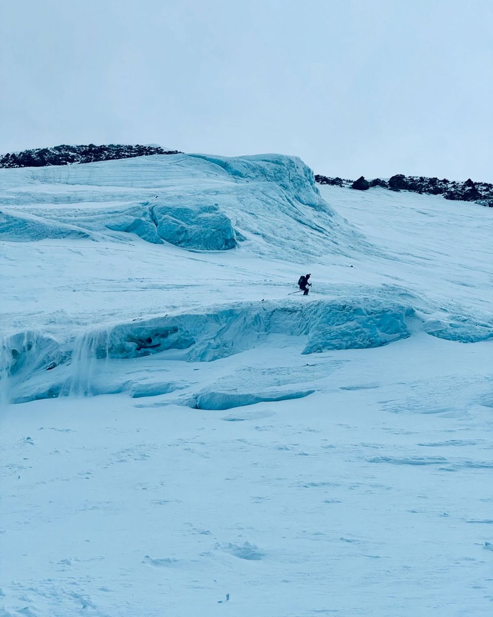I due hanno lasciato il rifugio Les Conscrits con 10 chili nello zaino, sciando la Nord della Lèe Blanche e poi dirigendosi verso il Miage. Arriva poi l’Aiguille de Bionnassay, che si rivela più insidiosa del previsto: “Molto ghiaccio, poca visibilità. Abbiamo dovuto scovare una nuova linea sulla parete Sud Ovest. Fortunatamente Mathis Dumas ci guardava dal fondovalle con un telescopio e ci ha inviato delle foto con le linee disegnate”. I due arrivano al rifugio Goûter, per proseguire il giorno dopo verso la vetta del Bianco e poi verso lo sperone della Brenva. “Qui troviamo un enorme crepaccio a sbarrare la strada. Riusciamo a passare tramite una inusuale fessura tra due pareti di ghiaccio, usando i rampant per fare presa con gli sci: una prima volta per noi!”