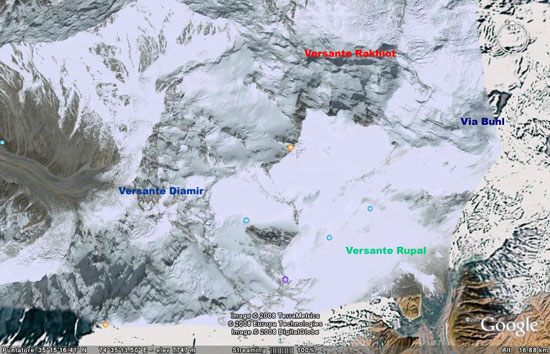 La montagna è costituita da tre versanti: a nord il Rakhiot, a ovest il Diamir e il Rupal a est. Dei tre lati quello più difficile è forse la Rakhiot, che come tutte le pareti nord, è meno soleggiata, più ripida, coperta di accumuli di neve e ghiaccio, e quindi più ostile. Fino alla scalata di Karl Unterkircher, Walter Nones e Simon Kehrer vantava solo due vie di salita, entrambe peraltro aperte sul bordo del versante: quella usata da Hermann Buhl nella prima salita del 1953 e e quella dei giapponesi del 1995.