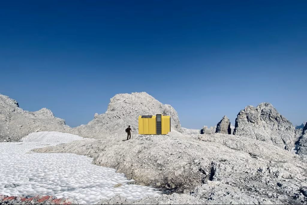 “Oltre all’organizzazione dell’impianto distributivo che rilegge l’impostazione dei bivacchi preesistenti, i piccoli manufatti sono stati integrati con una zona giorno ed un accesso laterale in modo da assicurare una corretta vivibilità della zona refettorio, dotata di alcune caratteristiche che identificano il manufatto come proprietà del C.A.I. sezione Fiamme Gialle. Innanzitutto i colori scelti – grigio e giallo – oltre a rendere il manufatto visibile richiamano i colori identificativi del Corpo. Più precisamente -su richiesta della committenza- è stata presa come riferimento la livrea dell’elicottero AW169, in modo da garantire il contrasto cromatico rispetto alla conformazione rocciosa che costituisce l’ambiente circostante. Per quanto riguarda i materiali, esternamente lamiera per resistere alle intemperie dell’alta quota, mentre internamente è stato pensato in multistrato di betulla. Un pannello fotovoltaico alimenterà una batteria alloggiata all’interno, che permetterà di ricaricare dispositivi elettronici, alimentare le luci interne e una luce d’emergenza esterna”.