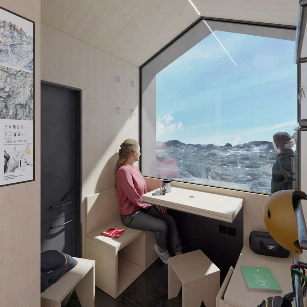 “Per dare risposta al bivacco come ricovero di emergenza si è partiti dalla fondamentale necessità che lo spazio interno possa accogliere la barella utilizzata oggigiorno negli interventi di soccorso alpino: l’ingresso è dimensionato affinché possa trovare riparo una Kong Lecco 2.0. Oltre a questo, sono stati ricavati dei posti letto rispettando quanto scritto nel bando: 9 fissi più tre suppletivi, quattro comprendendo lo spazio per la barella di emergenza. Il piccolo manufatto è stato anche pensato per poter essere usufruito durante il periodo invernale: oltre alla porta d’ingresso a due ante sovrapposte, è stato inserito un ingresso dal lucernario in copertura, spostato poi lateralmente nella fase definitiva” . spiegava l’architetto.