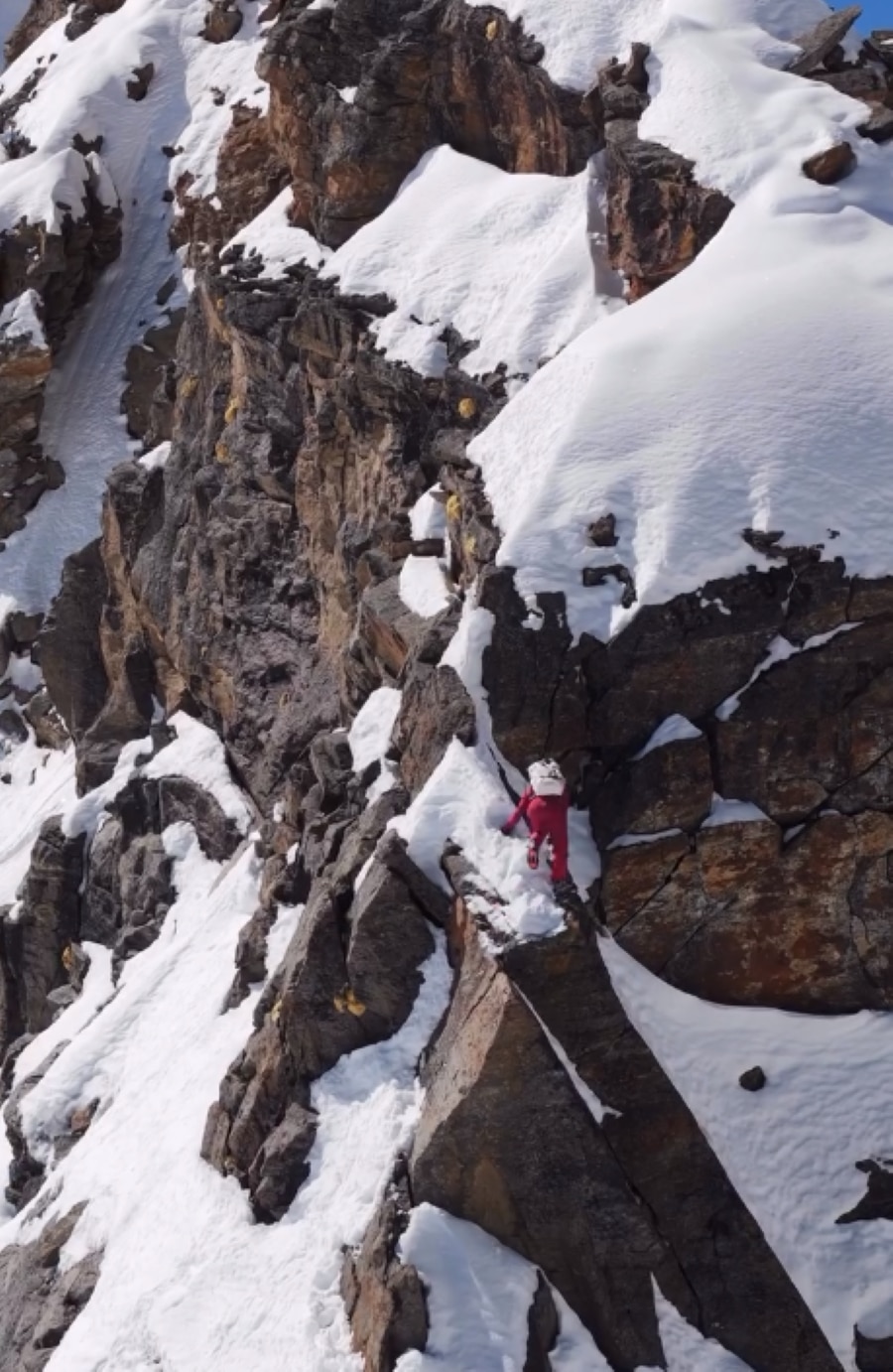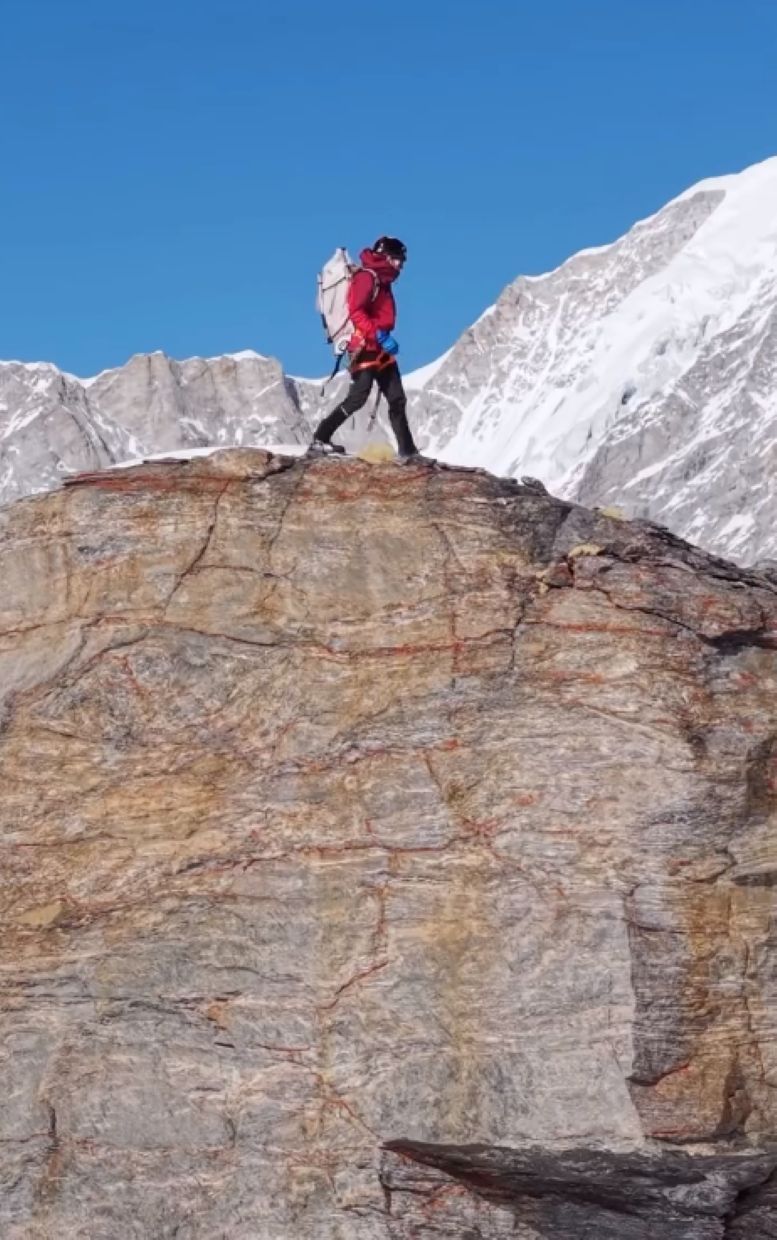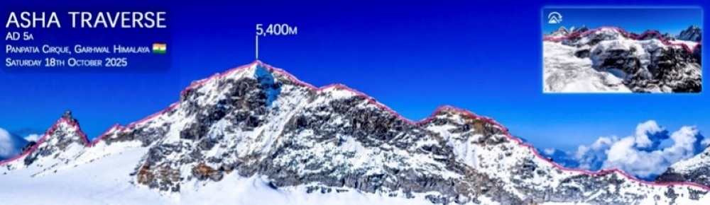 Rimasta sola, e considerata l’impossibilità di tentare in solitaria l’ascensione programmata, la Manners non si è persa d‘animo e ha fatto una scelta originale, dettata dal caso: “La mia compagna Michelle è rimasta nel campo base, malata e cercava di riprendersi, mentre io scalavo da sola verso il campo base avanzato circondata da vette incontaminate. Un giorno ho seguito le tracce di leopardo delle nevi fino a una cresta remota, improbabile che sia stato scalato prima. L’ho chiamata Asha Ridge (AD, 5A). Asha è una parola indù che significa speranza, la luce che ti fa andare avanti anche quando le cose sono difficili. La linea percorre poco più di 2 km, ondulando su una serie di piccole cime. Aveva quella perfetta sensazione alpina: creste strette e esposte con ripide gocce su entrambi i lati, bilanciate con tratti più rilassati per muoversi in modo efficiente e godersi il terreno. Alcuni passaggi richiedevano mosse precise per assicurare la miglior efficienza delle mie piccozze. Un netto contrasto con il rumore di Delhi – solo io, una cresta himalayana non scalata e la quiete delle montagne”, ha scritto la Manners.