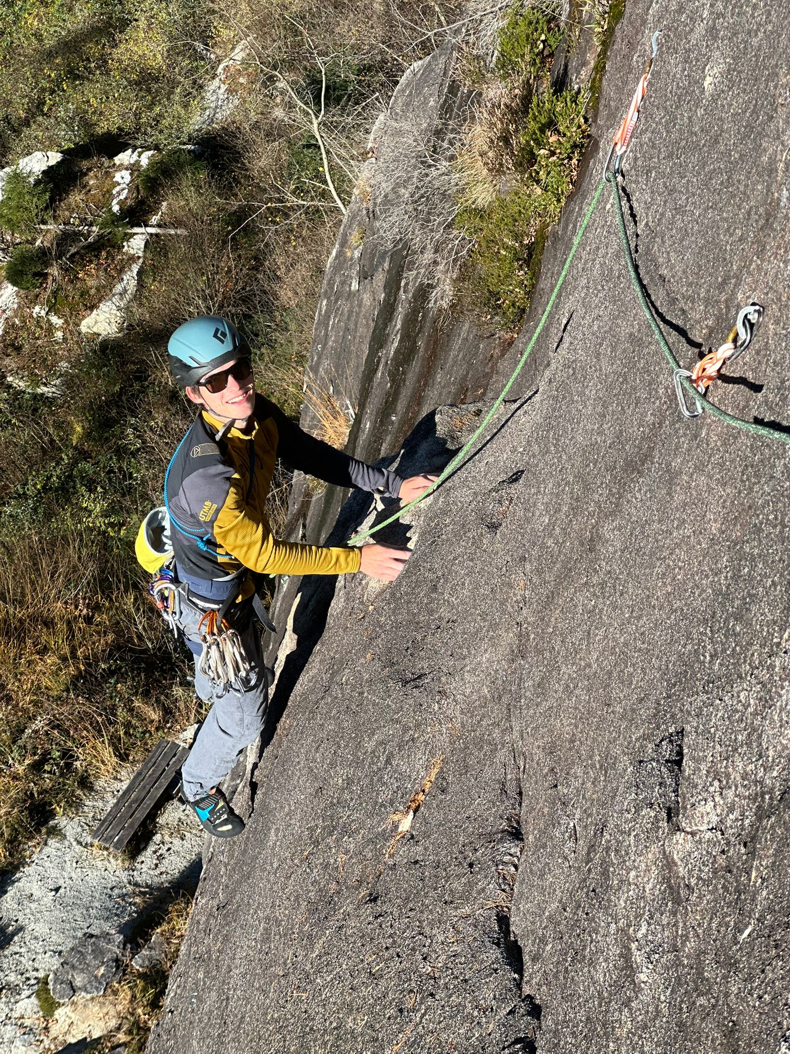 Valerio mi conduce alla base di una bella falesia ben esposta al sole, all’alba era sottozero, ma ora si scala bene, su un granito scuro, placido e solidissimo.