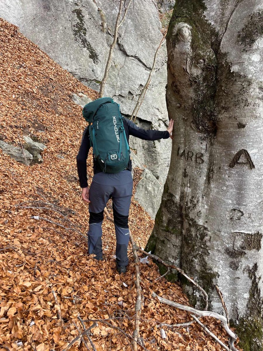 Risaliamo canali ricolmi di foglie di faggio, superiamo piccoli risalti, ci avvinghiamo a ginestre e ginepri per guadagnare quota. Da pulpito a pulpito, come su una scala nascosta. Su alcuni faggi secolari, guardiani della valle, troviamo lettere incise, forse l’antico segnavia dei cacciatori. Segni, odori e suoni dei camosci ci accompagnano. Sono loro, più di qualsiasi traccia umana, ad aiutare a trovare la via.
