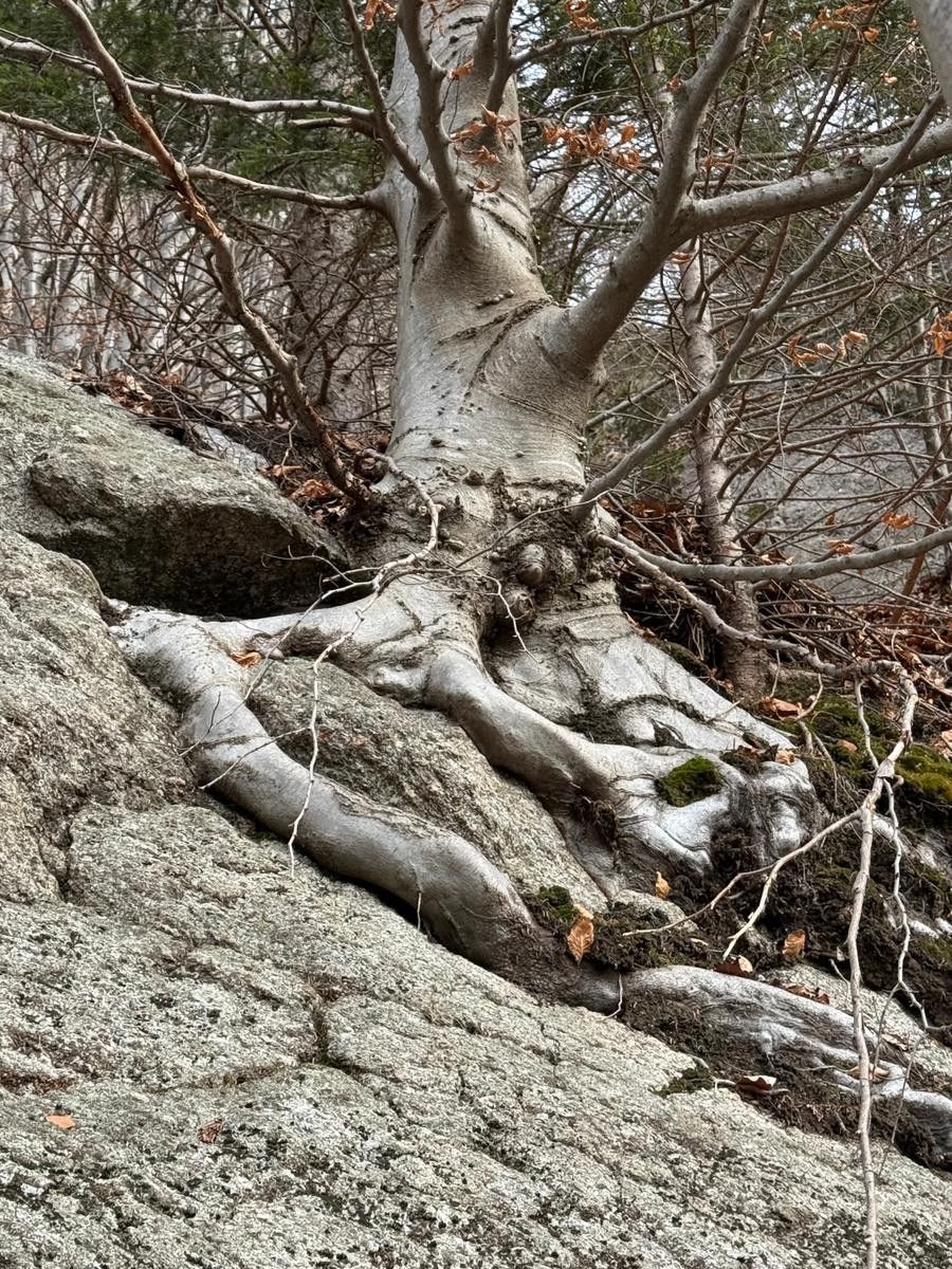 Più in alto, la rosa canina – con le sue belle bacche rosse – popola i canali d’erba ascendente e artiglia senza pietà i nostri vestiti. Saliamo, scendiamo, aggiriamo, seguendo uno strano labirinto di indizi che ci conduce al grande abete cresciuto a sbalzo, proprio sotto al “becco” del Pappagallo.