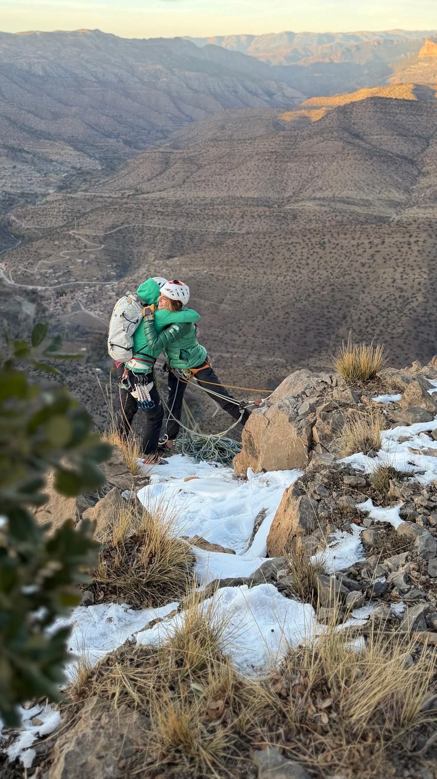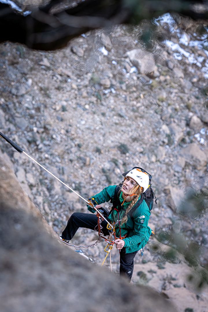 Win Oumalou intreccia un ampio spettro di stili: una delicata placca tecnica, una traversata in fessura sotto un tetto, un sorprendente tiro verticale su un sottile pilastro e un’ultima fessura in diedro che porta in cima alla via. Le due alpiniste lavoravano in modo efficiente ogni pomeriggio quando la parete veniva raggiunta dal sole: iniziavano la giornata al freddo, con piumini e guanti, prima di riscaldarsi con la luce man mano che salivano più in alto. Dopo aver attrezzato la linea per le calate in corda doppia e aver segnato una discesa percorribile con degli ometti di pietra, sono tornati l’ultimo giorno per scalare in libera l’intera via, confermandone il grado e godendosi appieno il flusso di ciò che avevano creato.