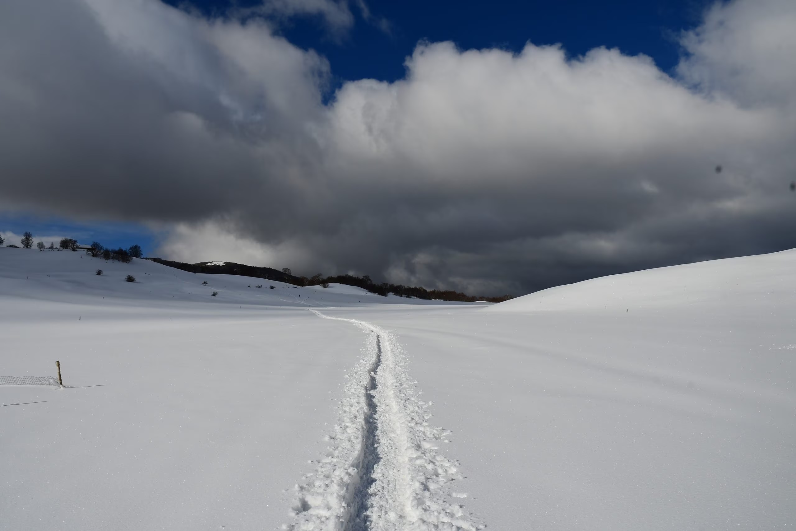 Accanto al rifugio del Diavolo (1395 m), chiuso da anni, che si raggiunge in auto da Pescasseroli, Bisegna o Gioia nei Marsi, si imbocca la carrareccia innevata che raggiunge il pianoro della Penna e una sbarra, entra nella faggeta, e poi sale a mezza costa. La salita porta all’altopiano della Cicerana, in vista della piramide del Velino, che si traversa in piano per poi salire all’Ecorifugio (1572 m, 1.30 ore).