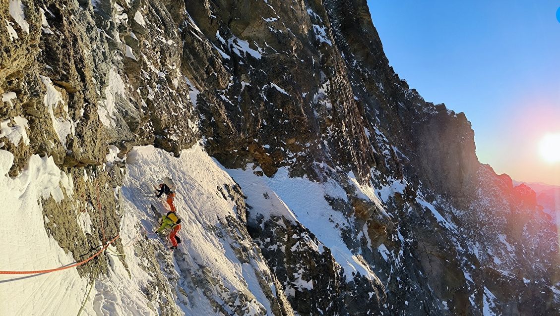 “Scalare l’Occhio è stata un’ottima decisione, con roccia più o meno buona e ripida fino a M7. Dopo questa parte, abbiamo finalmente raggiunto la zona di bivacco, che era ovviamente molto scomodo. Non c’era abbastanza spazio per tutti e tre, e la fredda notte non ci ha fatto chiudere occhio”, ha scritto Schupbach.