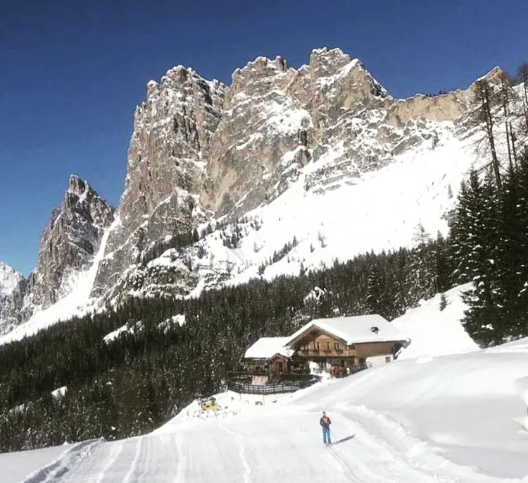 Un’altra escursione facile ma che porta a “ staccare” dalla Cortina più animata per immergersi in un bosco silenzioso per poi emergere su assolati pascoli alpini inondati di sole, è quella che conduce a Malga Ra Stua (1696 m). Si comincia a camminare lungo una strada innevata quasi sempre battuta ( ramponcini vivamente consigliati) dal tornante in località Sant’Uberto (1425 m), a 6 km da Cortina lungo la strada statale 51 per Dobbiaco. Dopo circa un’ora superando 300 metri di dislivello si è alla malga (aperta anche d’inverno). Grandi visioni durante la salita sulla Tofana di Dentro, con il suo tagliente spigolo sommitale. I più allenati possono proseguire per il Rifugio Sennes (2126 m) lungo la strada bianca (segnavia n.6) abitualmente battuta, ma talvolta potrebbero essere necessarie le ciaspole. L’itinerario dopo il pianoro di Cianpo de Cros si impenna nella Val Salata, prima di giungere sull’altipiano di Senes, e al rifugio. In questo caso il dislivello è di 700 metri e vanno messe in conto almeno 3 ore. Lassù l’ambiente è magico, siamo sugli altipiani carsici che caratterizzano questo settore delle Dolomiti, dove non si impongono le alte vette, ma le dolci ondulazioni immacolate e baciate dal sole.
