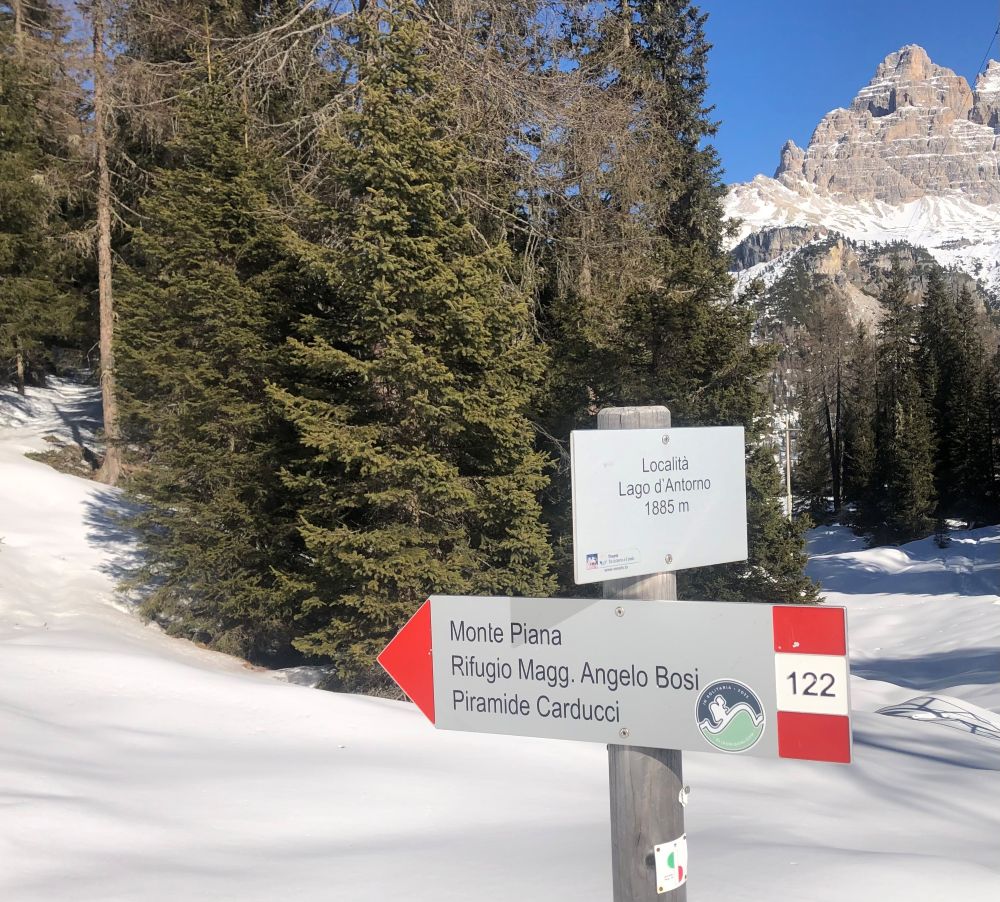Partendo da Misurina – 13 chilometri da Cortina – una meta classica invernale, per chi vuol godersi il sole e panorami grandiosi, è la salita al Rifugio Angelo Bosi al Monte Piana (2205 m). Si tratta di superare gradualmente un dislivello di 450 metri in un paio d’ore, prima attraverso il sentiero n. 122, che inizia poco oltre il Lago d’Antorno, e che poi si immette sulla ex strada militare della Grande Guerra. A ogni tornante si spalancano davanti agli occhi grandi visioni sulle Tre Cime di Lavaredo, la Croda dei Toni, i Cadini di Misurina, le Marmarole, l’Antelao, il Sorapiss. Raggiunto il rifugio (aperto anche d’inverno) si può proseguire con le ciaspole, seguendo le tracce nella neve, fino a raggiungere la sommità del monte (2324 m) dove il panorama, ora a 360 gradi, spazia fino alle vette austriache. Fino al rifugio abitualmente si cammina su neve battuta.