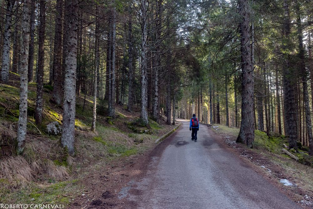 Continuando il percorso in leggera discesa si termina di attraversare la zona prativa di fondovalle e, dopo 700 metri, si arriva ai margini del bosco in località Bosco Pizzotto. Si procede verso destra tenendo il largo sentiero che avanza nel fitto di un grande bosco in cui la luce fatica a penetrare. Dopo 1,5 km si raggiunge un bivio a quota 1.600 m in cui si lascia il sentiero che si percorreva per prendere verso sinistra. Un cartello con precise indicazioni storiche informa che si sta procedendo su una strada rotabile militare che conduceva al forte Spitz Verle, realizzata nel primo decennio del ‘900.