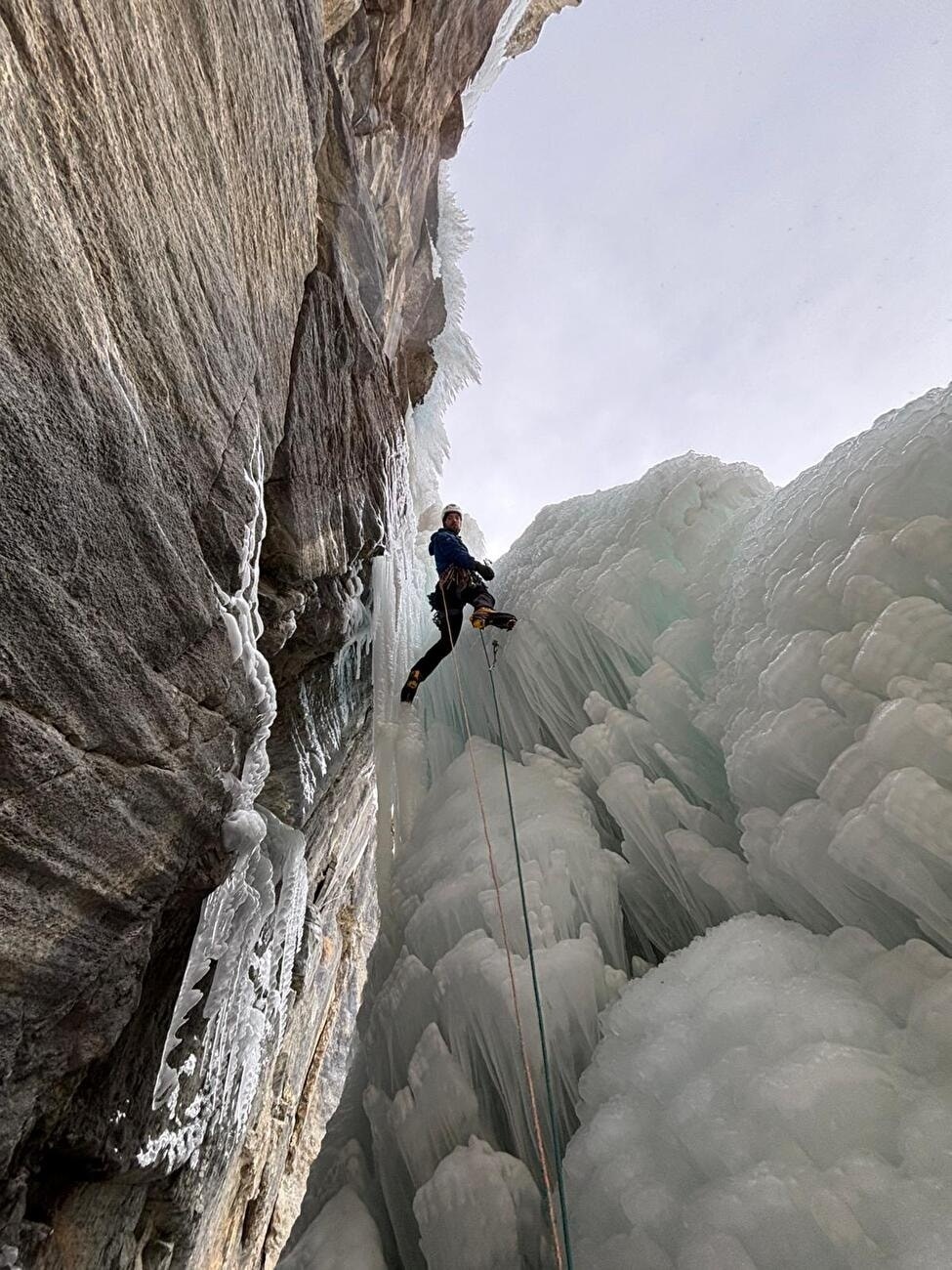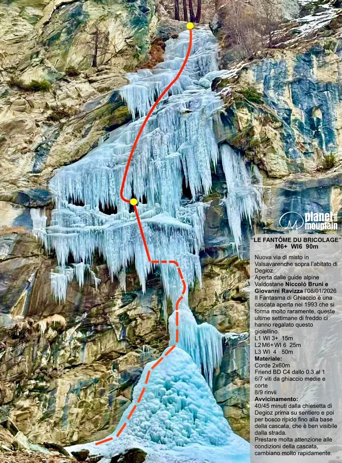 “Che la Valsavarenche sia la nuova casa del ghiaccio ormai si è capito, ma Nic ed io in questa stagione praticamente ne stiamo acquisendo la cittadinanza onoraria. Un giorno Nic mi propone di andare a salire una cascata che si forma una volta ogni morte di Papa e che quest’anno sembra in piedi: Il fantasma di ghiaccio” ha scritto Ravizza. I due sono partiti attrezzati per scalare in dry tooling sulle frange, nel caso in cui la candela di ghiaccio non fosse stata abbastanza stabile per permettere la salita, e così è stato. È nata Le fantome de bricolage, “bellissima variante dry che attacca due frange belle cariate da salire con la massima delicatezza, nonostante gli avambracci che vanno via via a gonfiarsi (da lì il grado di ghiaccio)”. 90 m, M7, WI6 è la difficoltà assegnata alla via.