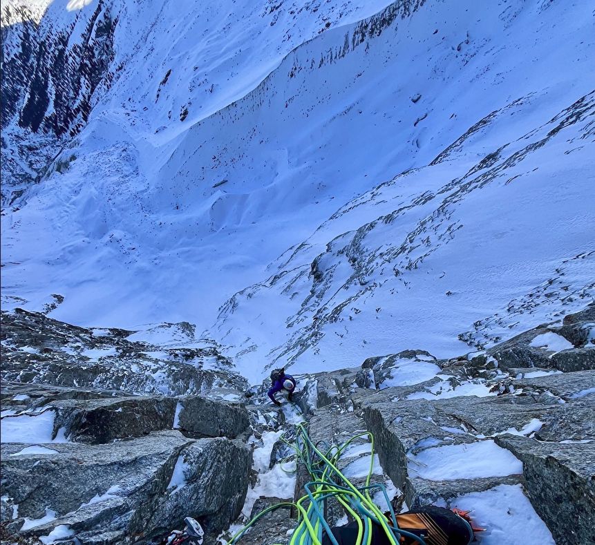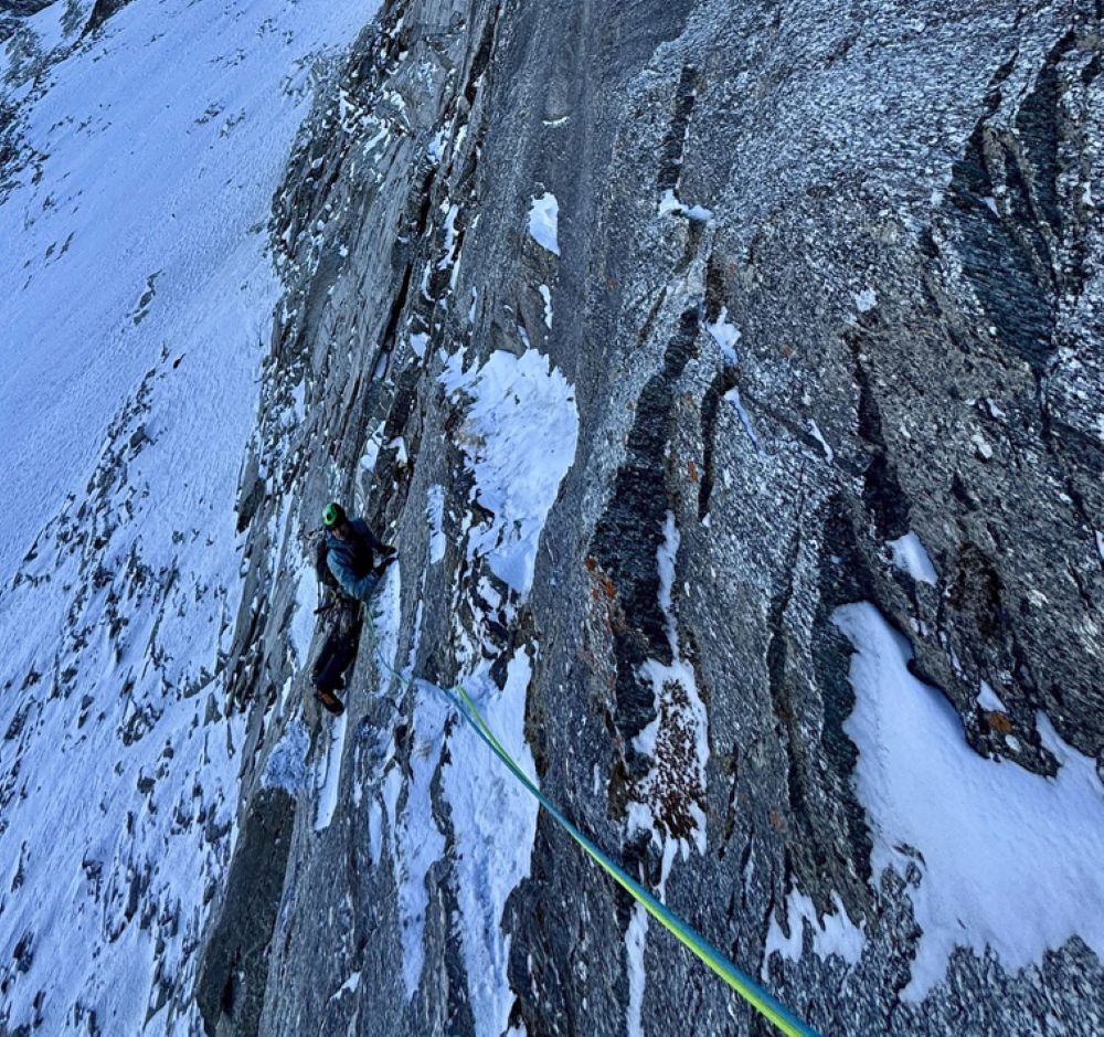 “Per i primi due tiri siamo riusciti ad aggiungere una nuova, impegnativa variante di partenza diretta. I tiri che seguirono furono… speciali. Nessuno toccava questo terreno da oltre 30 anni – e mai d’inverno (aspettatevi 3 metri dove il percorso si incrocia con un recente progetto). Dopo 7 tiri duri tra M6 e M7+, terreno più facile su ghiaccio ripido, cornicioni innevati e lastre ci hanno portato all’uscita. Poco prima delle 19 eravamo sulla vetta del Sagwand”, ha scritto Waldner.