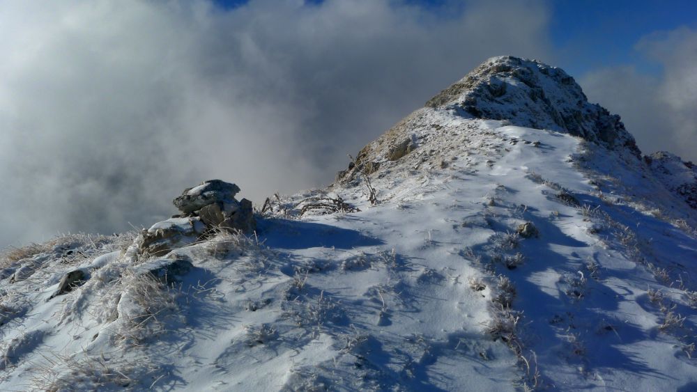 Oltre questo punto sono quasi sempre necessari la piccozza e i ramponi. Il sentiero estivo risale un ripido canalino, si sposta di qualche metro a sinistra, sbuca in cresta e continua con brevi saliscendi, con scorci spettacolari e vertiginosi sulla parete Nord. Da una selletta, un sentierino sale a una piccola grotta-ricovero e poi alla grande croce della cima (Monte Tino su alcune carte, 1923 m, 0.15 ore), belvedere su Celano, il Fucino e l’imponente massiccio del Velino.