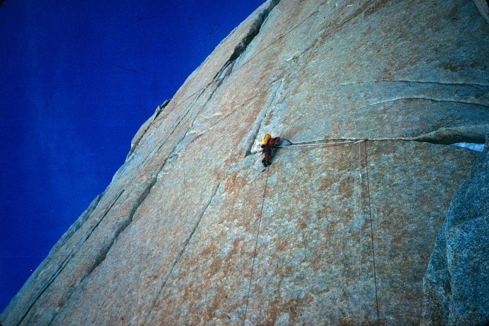 L’immenso diedro verticale che solca la Est del Fitz Roy viene tentato per la prima volta da una spedizione francese nel 1968 che si arresta dopo aver salito 500 dei 1200 metri totali.