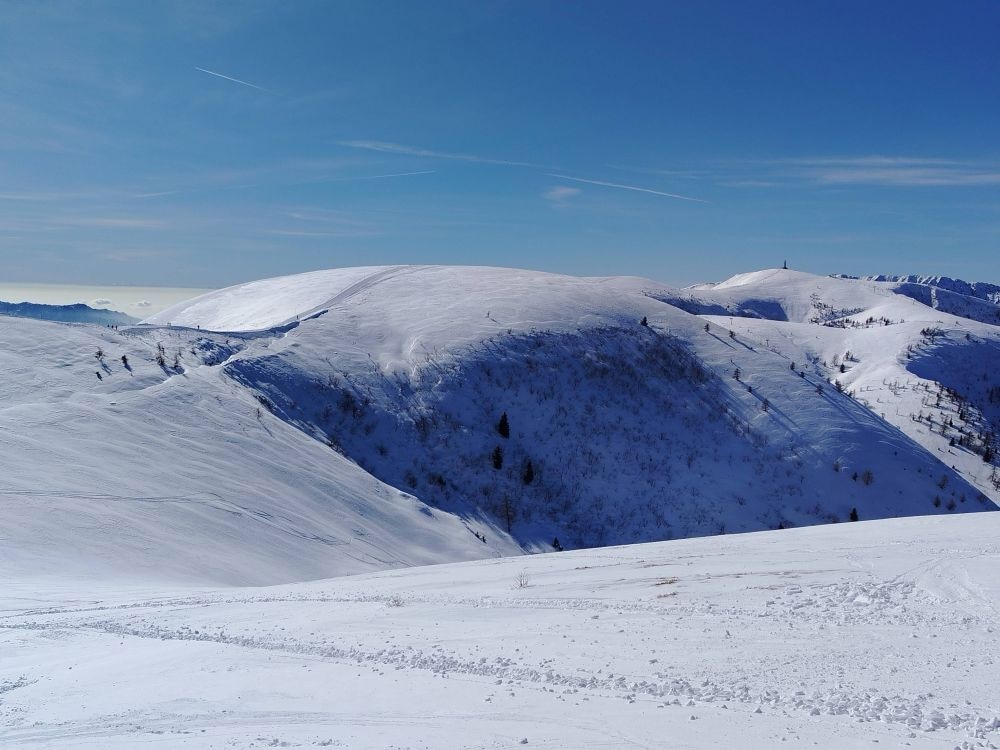 C’era una volta Montecampione, stazione sciistica della bassa Val Camonica (BS) che sul finire del secolo scorso raggiunse importanti vertici di notorietà tra gli sciatori. Poi una serie di problemi societari segnò la decadenza, con impianti fermi e piste da discesa ridotte all’osso e che non aprivano tutti gli inverni. Nemmeno il traino di due campionesse come Nadia (oggi apprezzata commentatrice sulle reti RAI) ed Elena Fanchini, quest’ultima scomparsa prematuramente per una malattia, entrambe capaci di vincere medaglie ai campionati del mondo di sci riuscì a risollevare le sorti della località. L’inversione di rotta dovrebbe iniziare il prossimo inverno con la prevista riapertura di due seggiovie al posto di altrettanti impianti fermi da anni per fine vita. Intanto però Montecampione è riuscito a conquistare uno spazio importante nel cuore di scialpinisti e ciaspolatori grazie alla favorevole conformazione del territorio e a grandi panorami che spaziano dalle pareti della Presolana del Pizzo Coca e dell’Adamello fino al Monte Guglielmo mentre a bassa quota si possono osservare il Lago d’Iseo e il Lago di Garda. Da non perdere, prima o dopo l’escursione, la salita al piazzale dove è stato installato un grande monumento dedicato a Marco Pantani che proprio qui conquistò una delle sue vittorie più entusiasmanti.