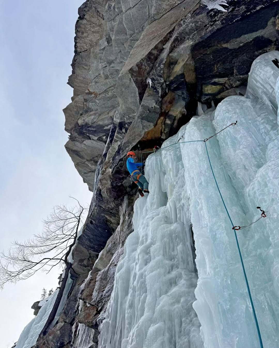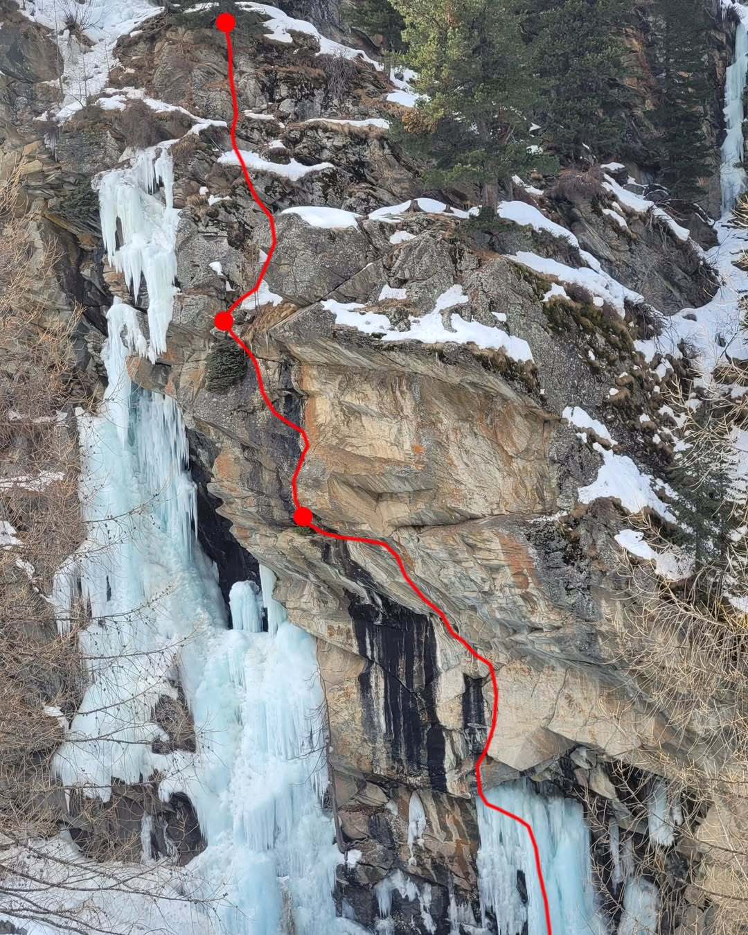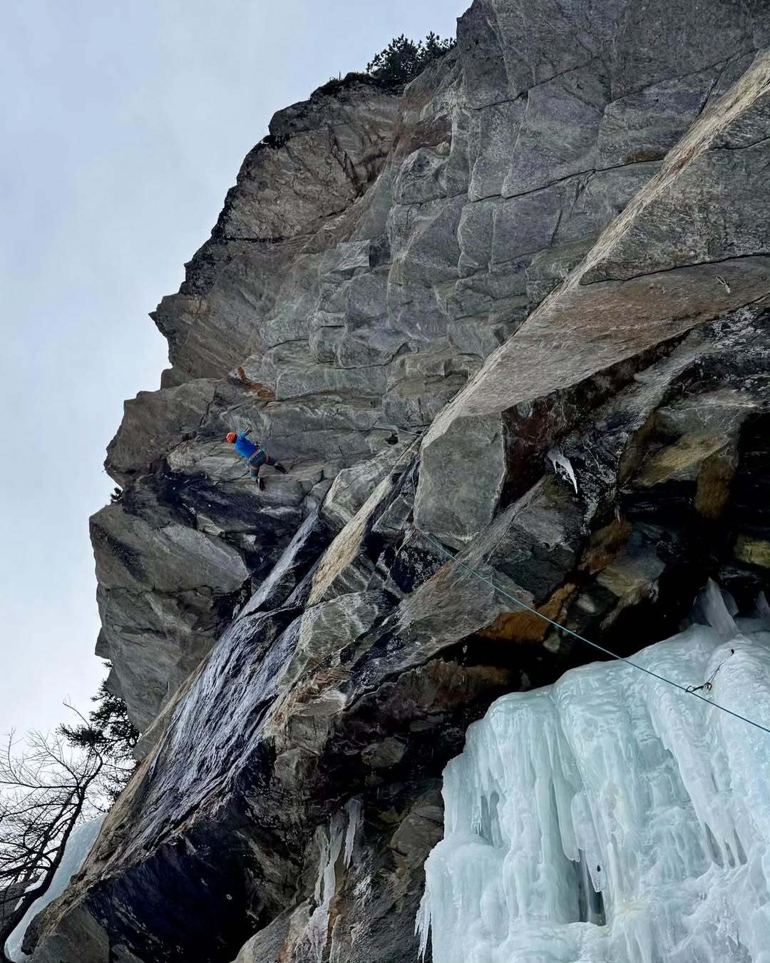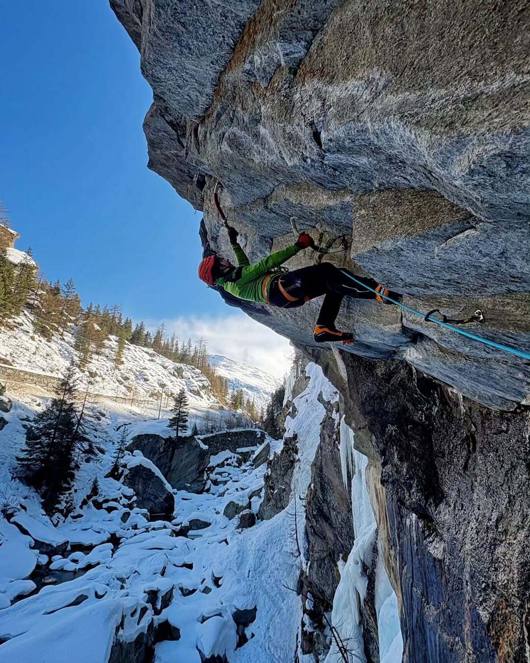 È proprio questo il risultato raggiunto da Babicz, che ha completato l’intero itinerario in libera, posizionando le protezioni durante la progressione. Nel suo racconto, l’alpinista descrive così la sequenza della salita: “Dopo aver concatenato i primi due tiri (L1 + L2, M11+), posando le viti durante la salita, ho proseguito sulla terza lunghezza, priva di ghiaccio (L3, D7, placca esposta), per poi completare la via con un tiro di misto (L4, M4+) che finisce a ridosso di un grande pino in cima alla parete”.
