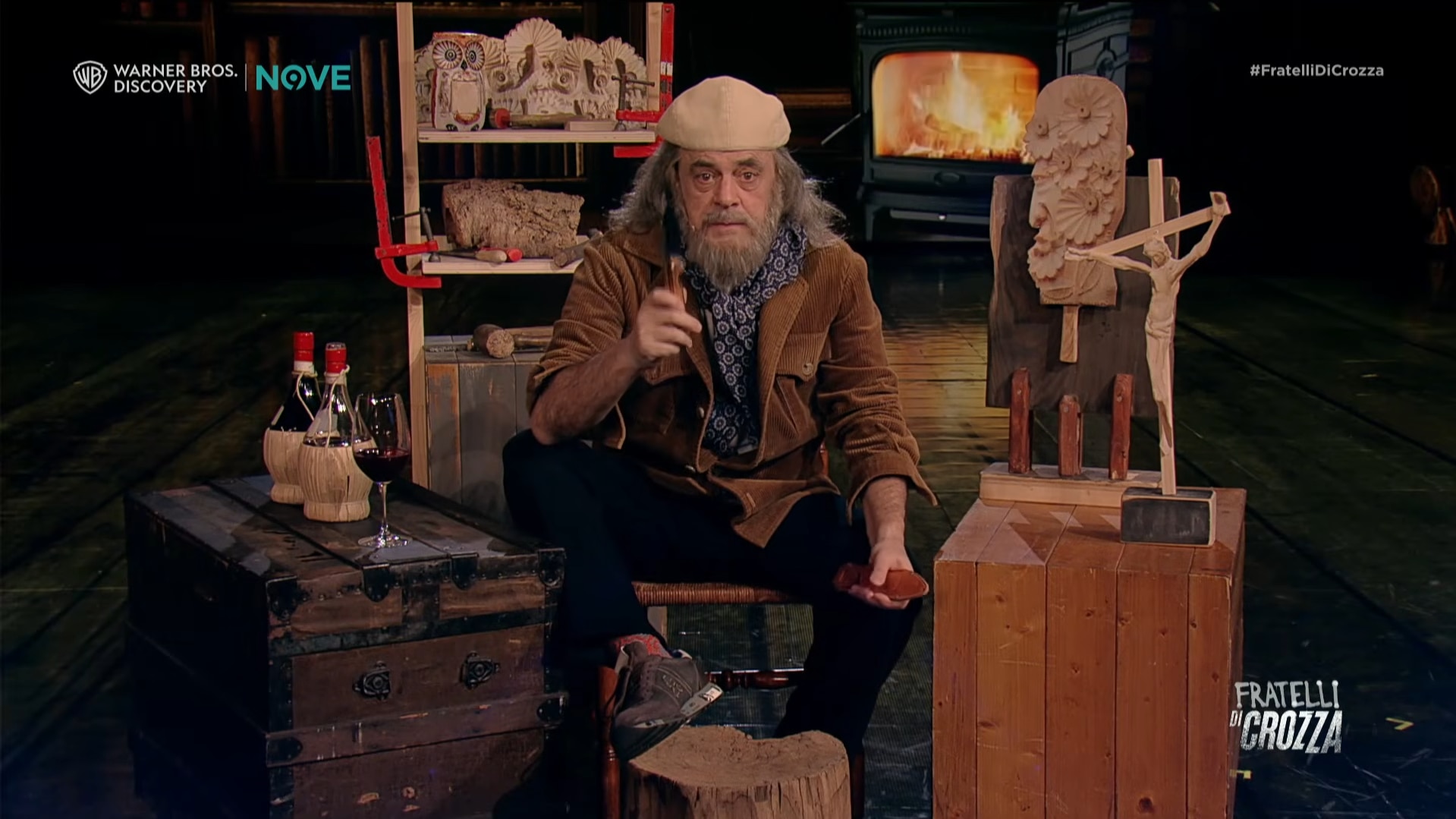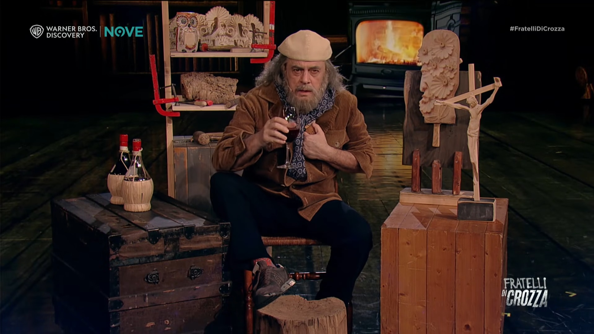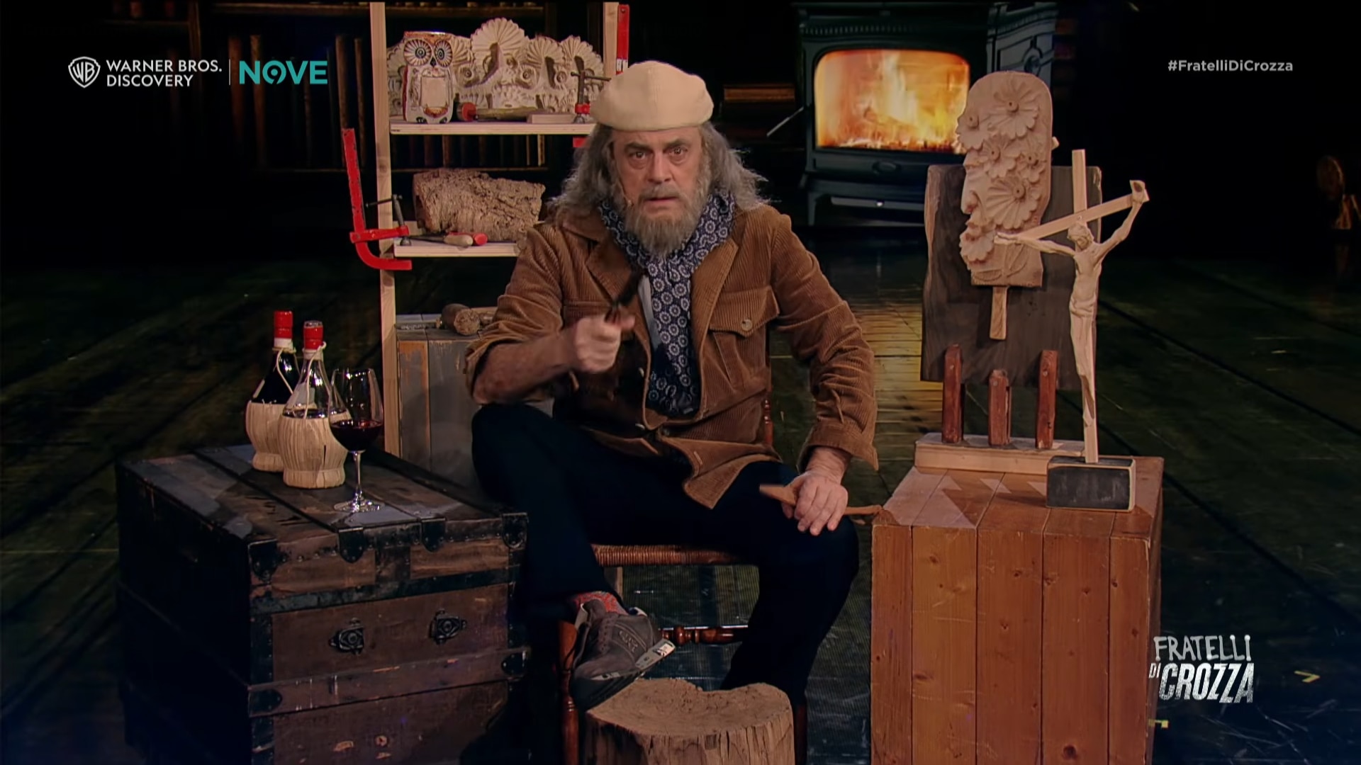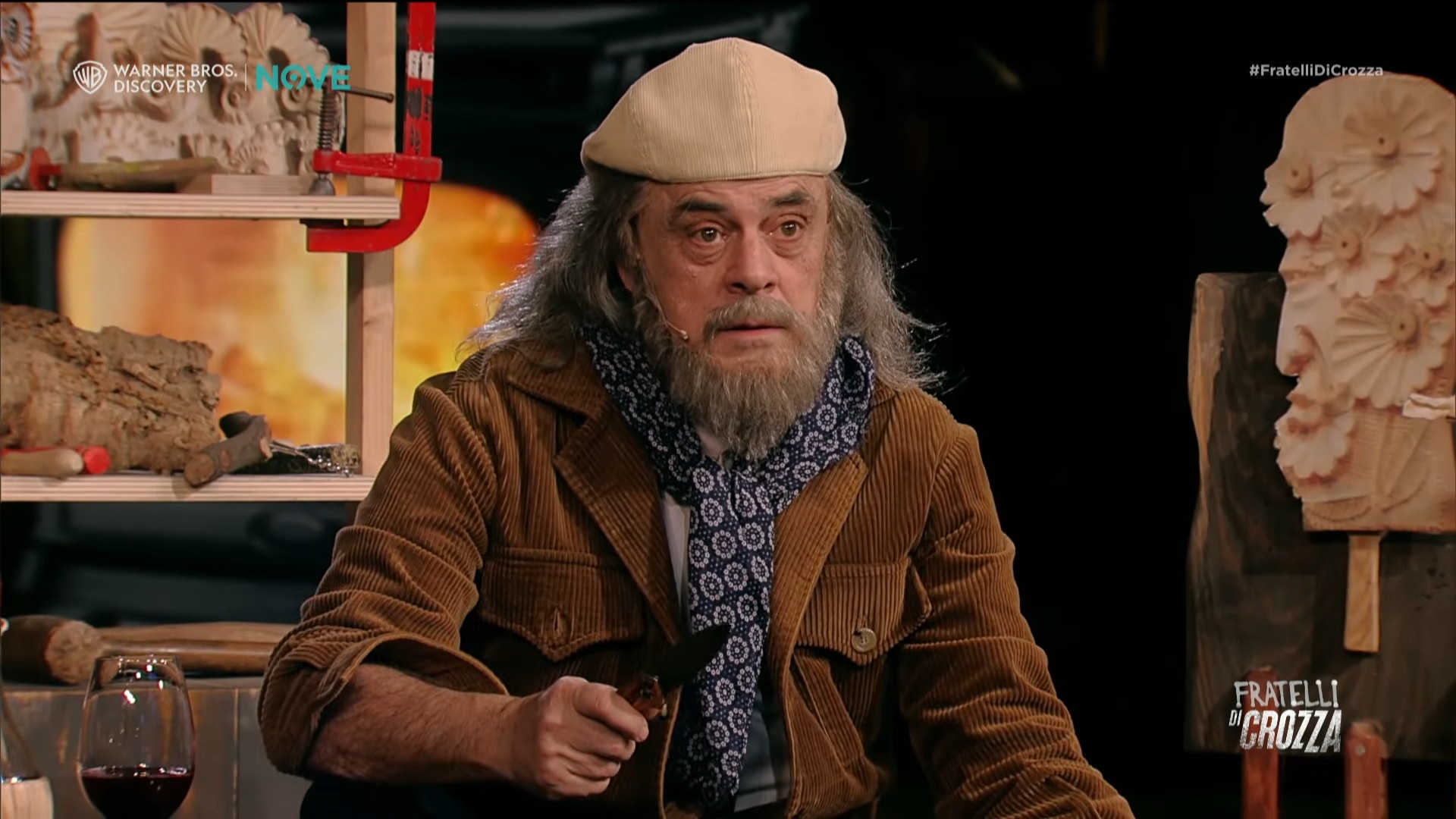Nella seconda parte, Crozza porta il discorso sul piano satirico, trasformandosi in una caricatura di Corona. Il coltello diventa un interlocutore, quasi un compagno da proteggere, in una scena che gioca sull’assurdità.
