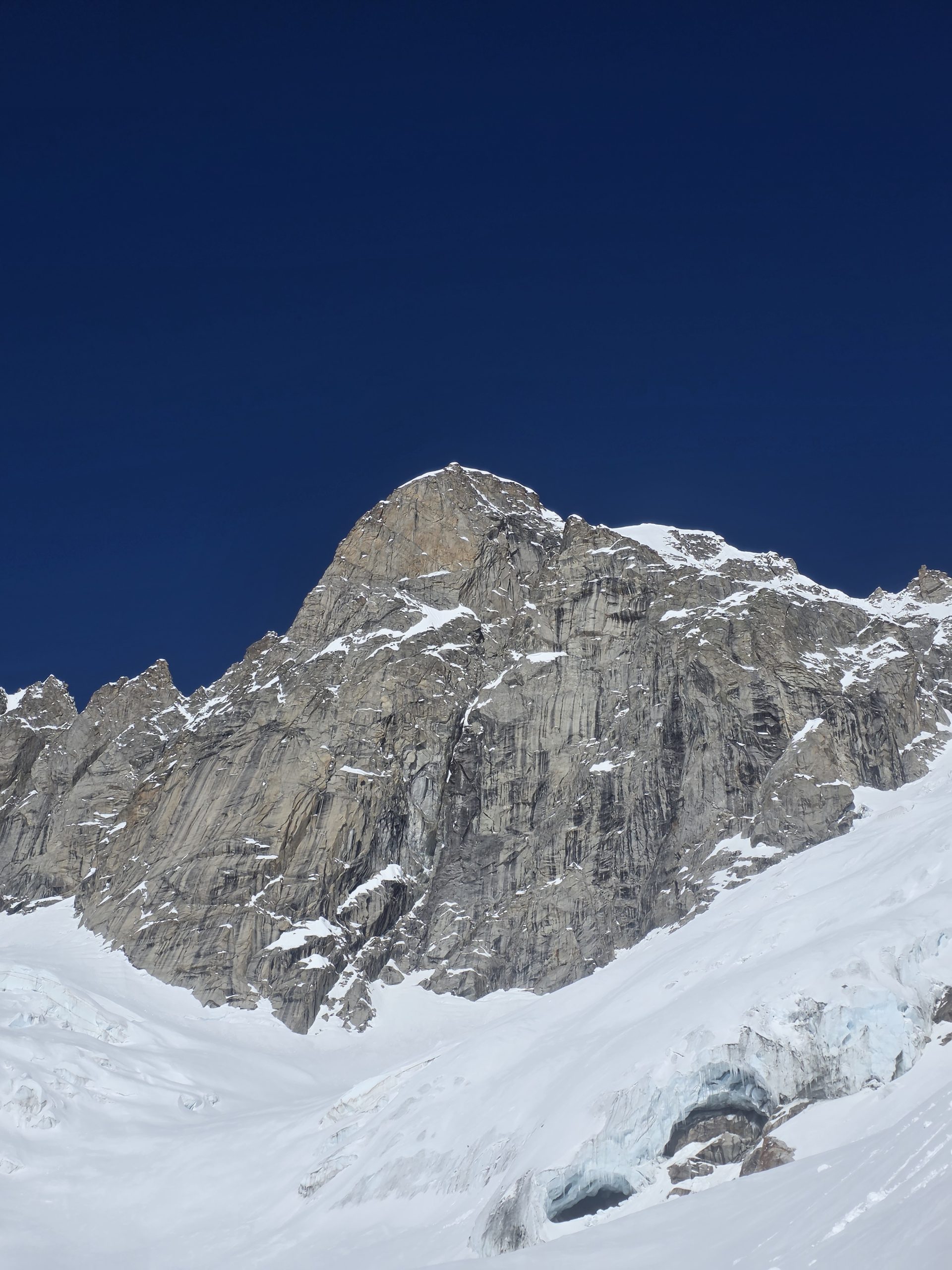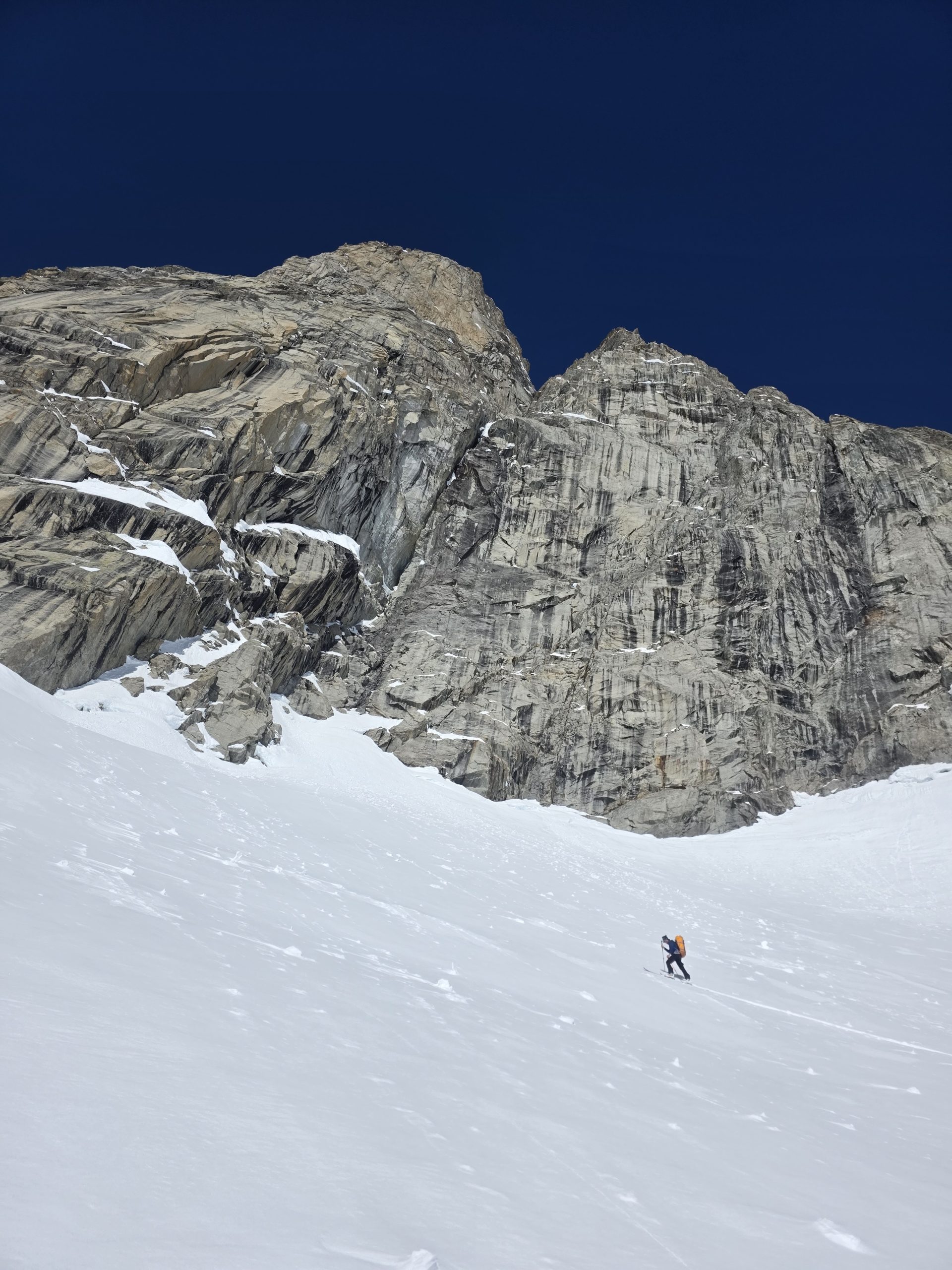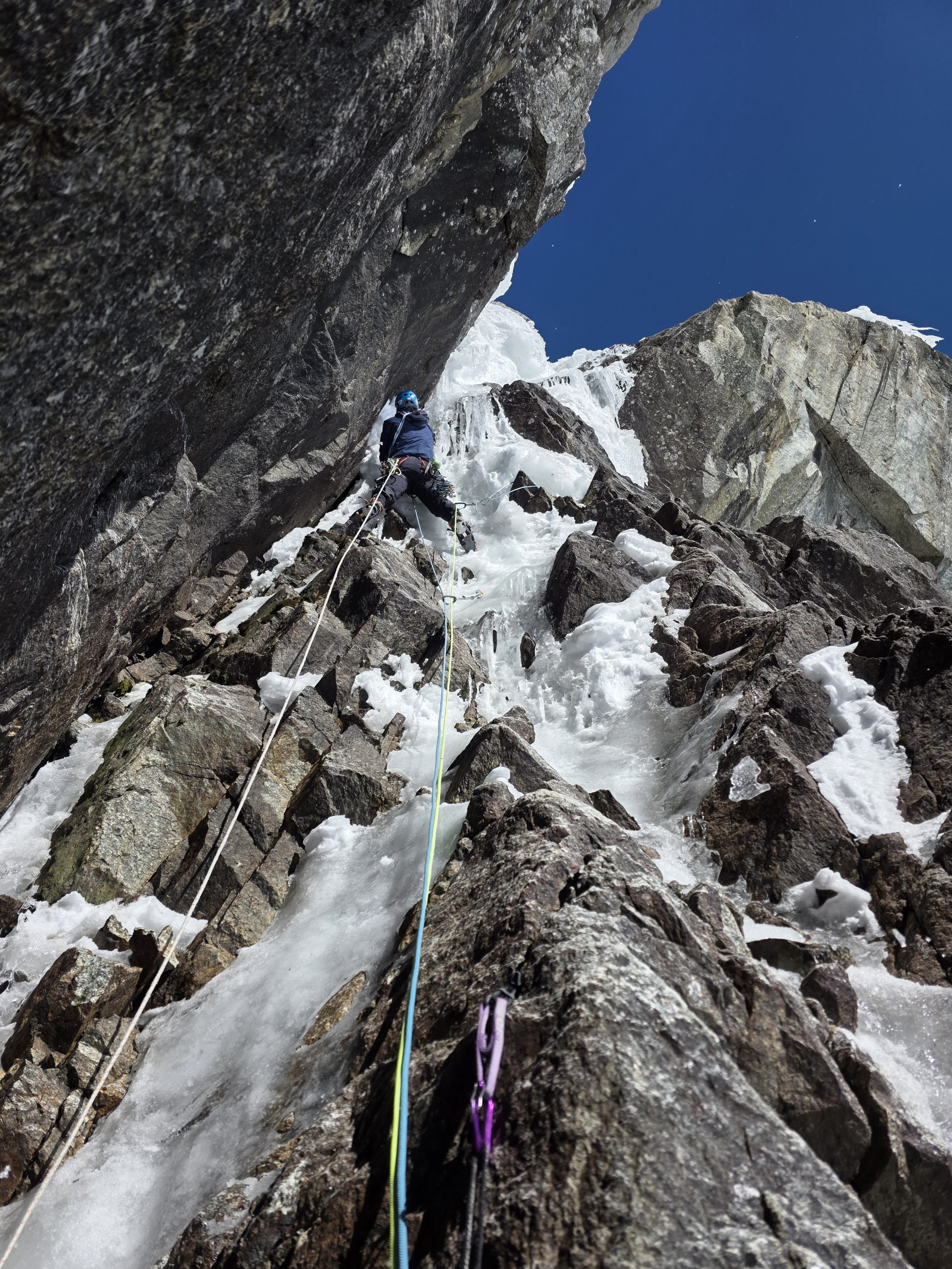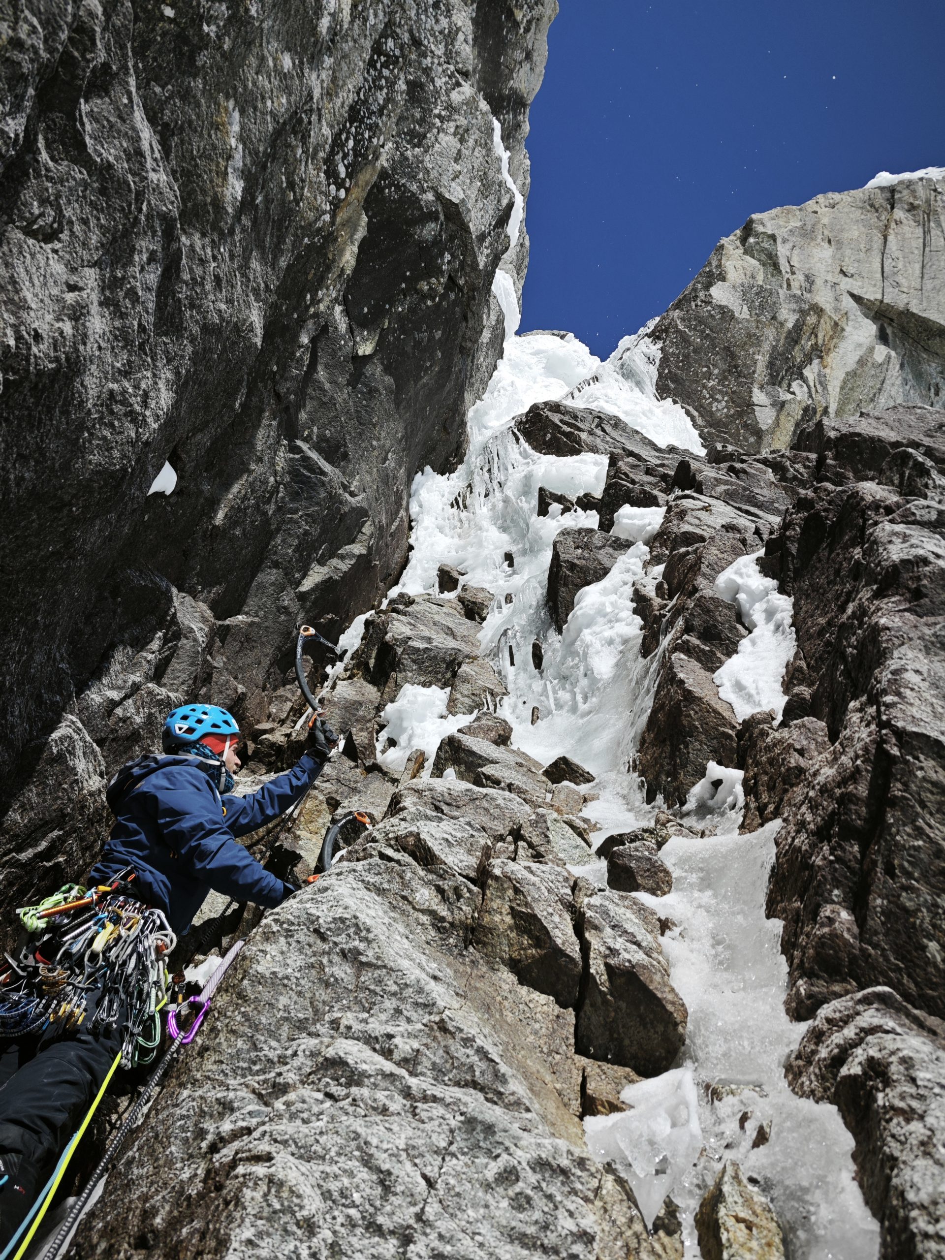 “Per me questa via è nata completamente dal nulla: non ero mai stato su questa parete e ho iniziato a guardarla solo quando Matteo mi ha proposto di unirmi”, spiega Mirco Grasso. “Dalle foto estive era evidente questo canale-diedro nero, sempre bagnato, e ho pensato che in inverno potesse uscire una bella linea. Sembrava quasi impossibile che una struttura così evidente non fosse già stata salita. Non sapevamo bene cosa aspettarci, anche perché è una parete sud, ma a oltre 3000 metri, in inverno, le condizioni pootevano essere qualsiasi cosa”.