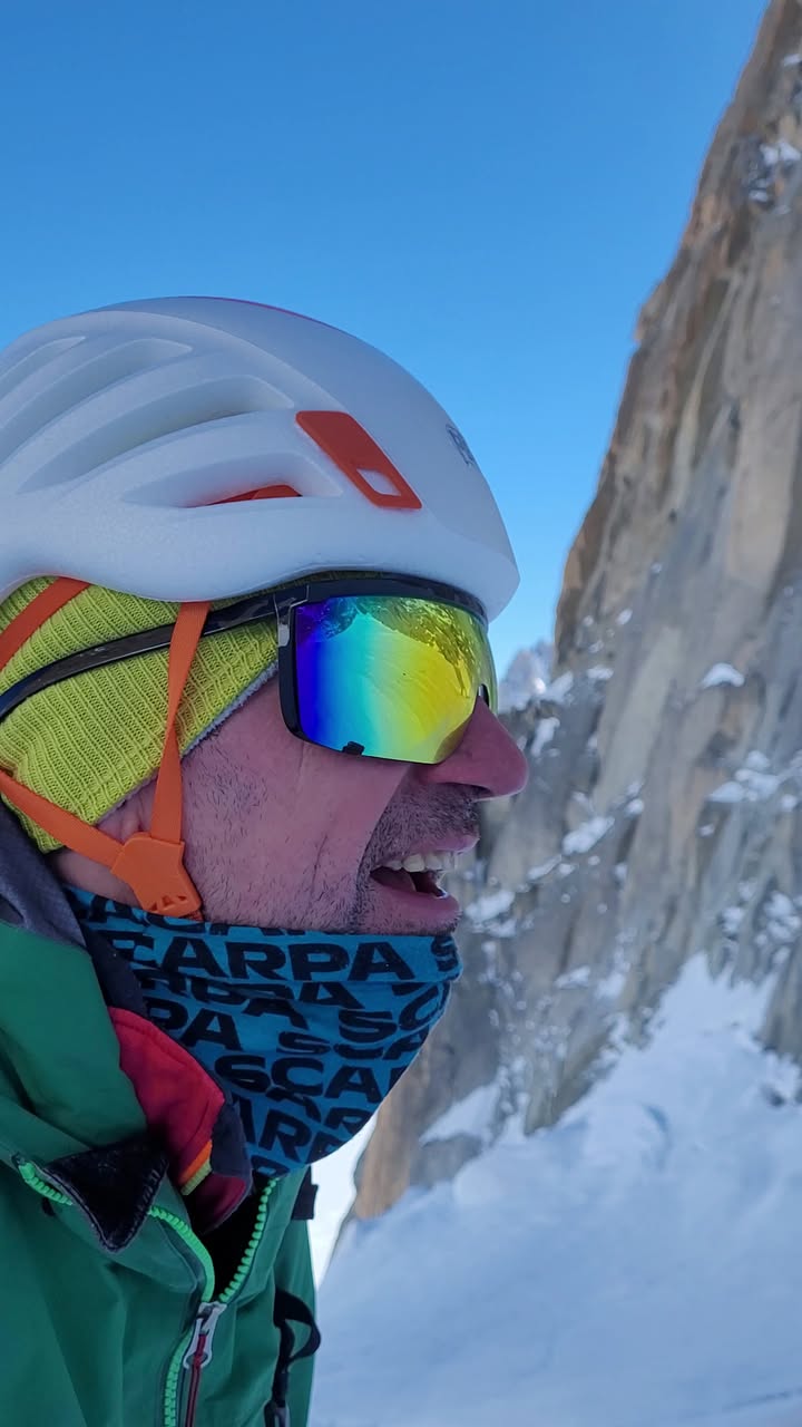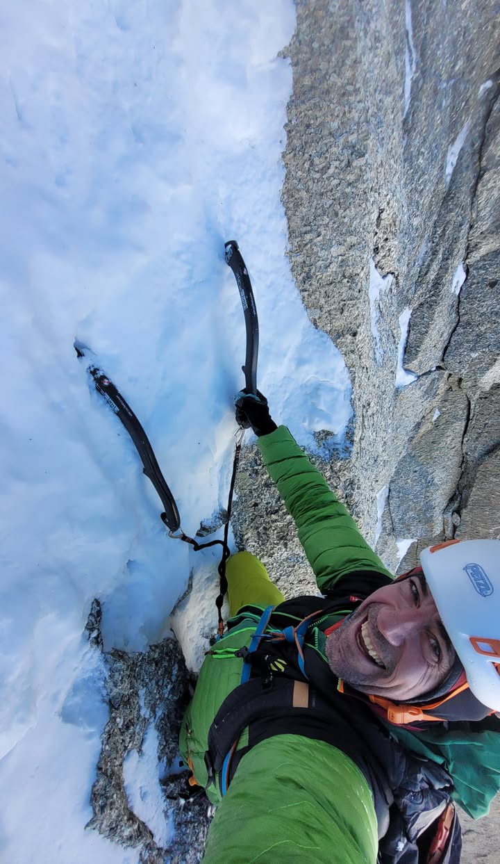 Dal colle in su, dove finisce la Goulotte Valeria, il cambiamento è stato netto. “Con il passaggio dal versante nord-est a quello sud, la qualità del terreno cambia drasticamente: da un bel ghiaccio alpino alla neve marcia sul traverso verso la cresta sud-ovest che in breve porta in vetta”.